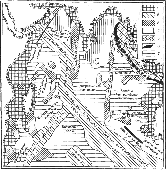 1 — подводные окраины материков, 2 — срединноокеанические хребты, 3 — океанические хребты и плато, 4 — конусы выноса мутьевых потоков, 5 хребты и депрессии переходной зоны, 6 — глубоководные желоба, 7 — котловины ложа океана