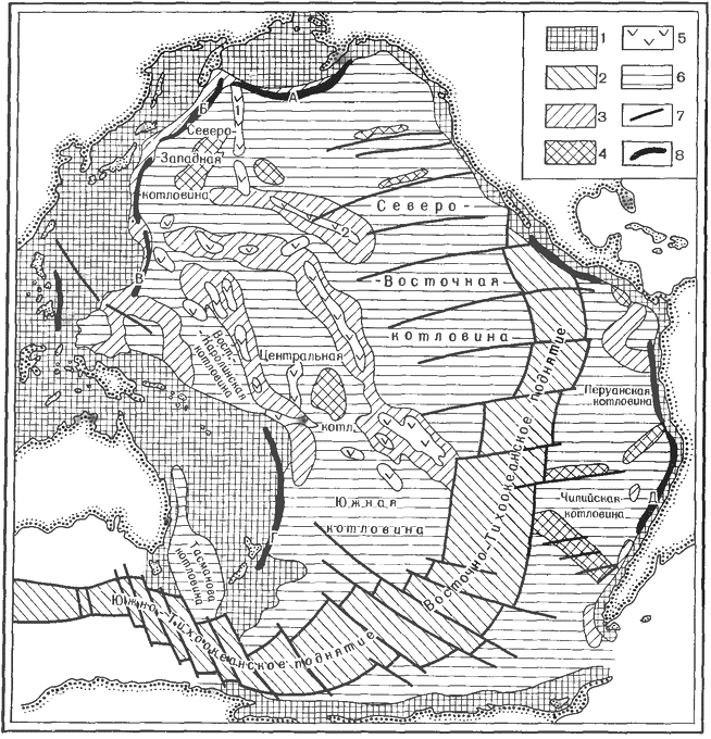 1 — подводные окраины материков и переходные зоны, 2 — срединноокеанические хребты, 3 — сводовые и сводово-глыбовые океанические поднятия, 4 — глыбовые хребты и плато, 5 — вулканические хребты (1 — Северо-Западный, 2 — Гавайский), 6 — океанические котловины, 7 — разломы, 8 — глубоководные желоба (А — Алеутский, Б — Курило-Камчатский, В — Марианский, Г — Кермадек, Д — Чилийский)