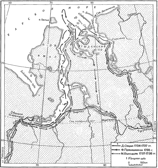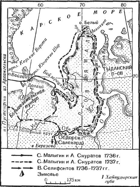 Зимой в Челябинске Паллас разработал для своего спутника, 17-летнего студента Академии Василия Федоровича Зуева, большой маршрут к берегам Карского моря для изучения северной части Урала; сам же Паллас весною отправился в Сибирь (см. гл. 11). Зуев летом 1771 г. от Обдорска на оленях двинулся на север и вскоре достиг северо-восточных предгорий Урала. «Рассеянные… лиственничные деревца и остролистные ольхи и тальники оказывались там и сям по холмам кустами; по удолам видны были то озера, то стекающие с гор… воды»[11]. По этим «от Урала к северу отошедшим горам» дорога была неровная и трудная. От вершины Байдарацкой губы Зуев повернул на северо-запад. Он ехал «по пространной мокрой степи… озера в себе заключающей», и не раз, отделяясь от отряда, осматривал небольшие бухты. Местность стала «посуше и поровнее… однако высочайшего хребта конец еще не совсем в виду был. Это были высокие, каменные, голые, острые гор маковицы [макушки], кои за 20 верст от морского берега будто раздробились и уничтожились». Зуев проследил восточный склон Полярного Урала на 170 км до Константинова Камня и обогнул его с севера. Еще несколько дней Зуев продвигался до устья Кары вдоль все понижавшихся гор, «в коих Уральский хребет пропадает и меж коими болотистые удолы лежали»: он открыл юго-восточный край хребта Пай-Хой. Холодное лето подходило к концу, Зуев повернул обратно и в январе 1772 г. нагнал Палласа у Красноярска. Всего он проехал на оленях более 600 км «через северную болотистую страну, тундрой называемую… до Карского морского залива, доставил первые известия о состоянии и естественных продуктах сей северной страны и северной части Уральского горного хребта». Он составил словари хантыйского, мансийского и ненецкого языков и написал одно из первых подробных сочинений о ненцах.Вторая экспедиция Палласа по Уралу и Поволжью