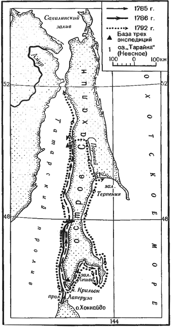 В 80-х гг. XVIII в. французское правительство приступило к организации морской экспедиции; основная ее задача заключалась в исследовании и по возможности захвате новых тихоокеанских земель взамен утерянных Францией владений в Северной Америке и Индии. В 1785 г. снаряжены были два военных корабля — фрегаты «Буссоль» и «Астролябия» с экипажем в 223 человека — под начальством Жана Франсуа Лаперуза (он же командир «Буссоли»), опытного 40-летнего моряка. Он взял с собой ученых различных специальностей. Командиром «Астролябии» назначили 40-летнего моряка Поля Антуана Флерио де Лангля. На берегу — по какой-то причине не включенный в списки — остался Наполеон Бонапарт, один из учеников Парижской военной школы. Обогнув мыс Горн и вступив в феврале 1786 г. в Тихий океан, Ж. Лаперуз прошел до чилийского порта Консепьсьон (у 37° ю.ш.), повернул к о. Пасхи, а оттуда к Гавайям и высаживался на о. Мауи. В июне фрегаты перешли к северному берегу залива Аляска. Ж. Лаперуз начал обследование с залива Айси-Бей (у 60° с.ш.) и шел оттуда вдоль берега в направлении, противоположном движению Кука в 1778 г., — на юго-восток, до залива Монтерей (у 37° с.ш.). После обхода он сделал верный вывод, что в 50-х широтах близ материка расположен архипелаг (теперь выделяют даже два — Александра и Королевы Шарлотты). Но детального осмотра этого побережья он не произвел. От Монтерея Ж. Лаперуз направился к Филиппинам, а весной 1787 г. начал обследовать берега Восточной Азии в умеренной зоне, постепенно продвигаясь на север. Французы нанесли на карту — очень неточную — берега Восточно-Китайского и Японского морей, поднялись на север почти до 40° с.ш. 3 июля суда оставили небольшую бухту и двинулись в общем к северо-востоку. Утром 7 июля с борта былаусмотрена гористая земля, протягивающаяся в меридиональном направлении. Самую заметную вершину Ж. Лаперуз назвал «Пиком Ламанон»[163]. Вскоре на море пал густой туман, и французы, считая, что перед ними побережье Йессо (о. Хоккайдо), шли далее на север практически наугад, а через пять дней бросили якорь в удобной бухте. Из объяснений местных жителей и чертежа, набросанного ими, Ж. Лаперуз понял: он находится на острове, который называется Сахалин, отделенном от материка и о. Йессо проливами. Корабли продолжали плавание к северу по Татарскому проливу (название дано Ж. Лаперузом), подходя то к азиатскому побережью, то к Сахалину, и 23 июля обнаружили небольшой залив Жонкиер, (впоследствии здесь возник город Александровск-Сахалинский; название залива на наших картах сохранилось за мысом). Севернее глубина моря стала уменьшаться — суда достигли входа в узкий пролив (в XX в. названный имени Г.И. Невельского), ведущий из широкого Татарского пролива в Охотское море. И тогда Ж. Лаперуз ошибочно решил, что перед ним — низменный перешеек, связывающий Азиатский материк с «полуостровом» Сахалин. Чтобы удостовериться в этом, он направил на шлюпке двух офицеров, вернувшихся 28 июля. Они подтвердили постепенное уменьшение глубин. Усилившийся ветер вынудил искать пристанище — суда получили небольшие повреждения, — и Ж. Лаперуз простоял до 2 августа в. обнаруженной им у 51°31' с.ш. удобной бухте, нареченной заливом Де-Кастри[164].
