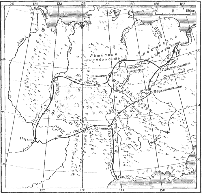 Пройдя затем к Сахалину, он двинулся на юг, проследил более 700 км побережья острова до южной оконечности, названной мысом Крильон и по пути 10 августа открыл о. Монерон. (Не ведая об этом, французы повторили, но в обратном направлении, маршрут М. Токуная.) После кратковременной стоянки у мыса Крильон Ж. Лаперуз впервые прошел из Японского моря в открытый океан проливом, впоследствии получившим его имя, затем вдоль дуги Курильских о-вов[165] и 7 сентября прибыл в гавань Петропавловска-Камчатского. Оттуда он послал в Париж сухим путем через Сибирь и Европу с экспедиционными материалами и картами Жана Батиста Лессепса, оказавшегося единственным участником экспедиции, вернувшимся на родину и завершившим кругосветное путешествие. От Камчатки Ж. Лаперуз перешел в Океанию, к о-вам Мануа из восточной группы Самоа. Здесь по невыясненным причинам 11 декабря произошла кровопролитная стычка, убито было 19 самоанцев и 2 француза, один из них — П. Лангль. Через два дня корабли двинулись на запад. За Уполу 17 декабря был открыт другой остров — Савайи, крупнейший в архипелаге Самоа. Оттуда Лаперуз направился к Австралии и в конце января 1788 г. стал на якорь в заливе Ботани. Там французы встретились с английской флотилией, доставившей в Восточную Австралию первую партию ссыльнокаторжных. Начальник флотилии Артур Филлип, назначенный первым губернатором колонии Новый Южный Уэльс, основал в 25 км к северу от Ботани, у залива Порт-Джэксон, одноименный поселок — «зародыш» будущего Сиднея. В феврале 1788 г. Ж. Лаперуз послал оттуда во Францию донесение, в котором, между прочим, сообщал, что собирается посетить острова Меланезии, в том числе Санта-Крус, обогнуть Новую Голландию и идти к о. Иль-де-Франс (Маврикий). После этого экспедиция вышла из Порт-Джэксона и пропала без вести. Только через 40 лет были найдены доказательства, что оба фрегата потерпели крушение у о. Ваникоро[166], из группы Сант-Крус, но судьба самих моряков — около 200 человек — не выяснена.Поиски прохода в Атлантику