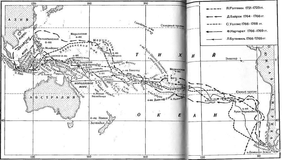 В 60-х гг. XVTII в. разгорелось англо-французское соперничество на океанах. На поиски Южного материка и новых или «потерянных» островов с целью подготовить их захват одна за другой направлялись экспедиции. Англичанин Джон Байрон плавал вокруг света, участвуя в каперской экспедиции (1740–1744) Джорджа Ансона, и описал это плавание. В 1764 г. Д. Байрон был послан на поиски земель, «на которые до сих пор не ступала нога европейца», в первую очередь атлантической «Земли Пепис», якобы открытой англичанами в 1684 г. у 47° ю.ш. Байрон «ошибся» на пять градусов широты, смешав «Землю Пепис», которую, разумеется, не нашел, а может быть и не искал, с Фолклендскими о-вами (см. гл. 18), высадился там и объявил их британским владением. Оттуда он перешел к Огненной Земле, где высаживался в нескольких местах и наблюдал быт огнеземельцев; он описывал их как «самые жалкие человеческие создания», которые ему, кругосветному мореплавателю, приходилось видеть. Пройдя вокруг мыса Горн в Тихий океан, Д. Байрон и там занялся поисками южных земель, в том числе открытых и потерянных испанцами Соломоновых о-вов, но нашел только небольшие острова. 7 июня 1765 г. он прошел через архипелаг Туамоту, посетил о-ва Кука, 24 июня обнаружил несколько атоллов из групп Токелау и Гилберта; один из них носит его имя — о. Байрон (1°20' ю.ш., 176°25' в.д.). Следуя затем через Маршалловы, Марианские и Филиппинские о-ва и посетив Яву, Д. Байрон, обогнув мыс Доброй Надежды вернулся на родину в 1766 г. В 1767 г. один из его спутников издал описание этого плавания.