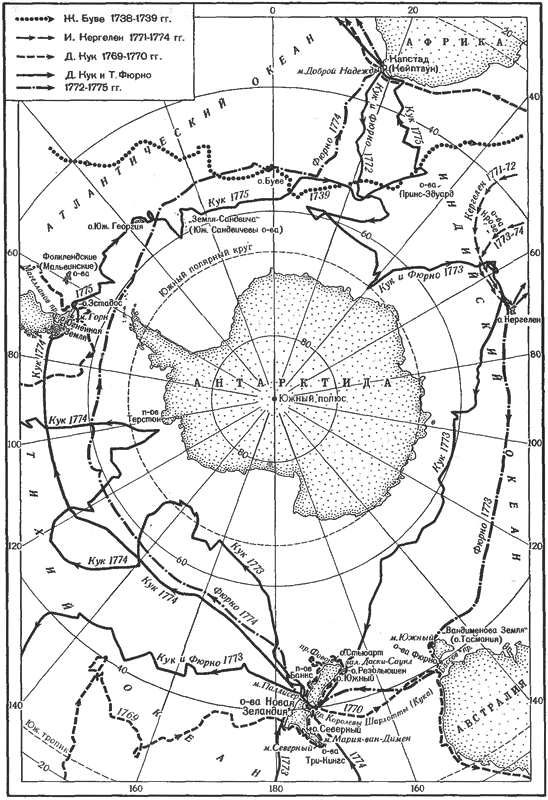 Южный материк все-таки мог существовать, и как бы «свидетелями» такой возможности были земли или миражи, усмотренные некоторыми мореплавателями на субантарктических широтах — за 50° ю.ш. Особое внимание адмиралтейство уделяло «Земле Обрезания» Буве. Такие земли считались или выступами (полуостровами) Южного материка, или островами, близкими к нему. Для его поисков — и с некоторыми другими заданиями — была отправлена вторая экспедиция Кука на двух новых кораблях: «Резольюшен», которым командовал сам Кук, и «Эдвенчер» под командой Тобайаса Фюрно, спутника Уоллиса. В распоряжении Кука — впервые в истории навигации — находился новый навигационный прибор — хронометр, стоивший тогда неимоверных денег. На борту «Резольюшен» были два натуралиста-немца: Иоганн Рейнгольд Форстер, собравший в пути большие географические и этнографические материалы, и его 17-летний сын Георг Форстер, прославившийся научной обработкой этих материалов (в начале XIX в. он стал профессором Виленского — ныне Вильнюсского — университета). 13 июля 1772 г. оба корабля оставили Плимут и 30 октября прибыли к мысу Доброй Надежды, в Капстад (ныне Кейптаун). Там Куку сказали, что на меридиане о. Маврикий за восемь месяцев до того француз Ив Кергелен-Тремарек открыл какую-то землю у 48°30' ю.ш. В Капстаде Иоганн Форстер встретился со шведским ботаником Андреасом Спаррманом и просил Кука взять его с собой, обещая из своих средств платить ему жалованье раз в год. И Кук согласился при условии, что Форстер оплатит и питание Спаррмана. 23 ноября суда пошли прямо на юг — отыскивать «Землю Обрезания». Через несколько дней сильным западным ветром их стало относить на восток. 7 декабря подул свежий ветер, перешедший в шторм. Температура резко упала до 3°С. Первые плавучие льды Кук встретил 10 декабря у 50°40' ю.ш., а затем начали попадаться большие ледяные поля. 13 декабря корабли были на широте «мыса Обрезания», но, по определению Кука, в 10° к востоку от него, и разыскивать «Землю Обрезания» он счел нецелесообразным. Температура понизилась до — 3°С. На случай разлуки с Фюрно в тумане или при пасмурной погоде Кук указал ему пункты встречи. Лавируя среди айсбергов, корабли все же шли на юг, подвергаясь большой опасности в тумане. Показались огромные ледяные поля, которые приходилось огибать, уклоняясь на десятки миль на восток. Среди команды появились признаки цинги. 29 декабря за 59° ю.ш. Кук решил идти на запад до меридиана «мыса Обрезания», чтобы узнать, остров ли там, или выступ материка. 1 января 1773 г. Кук пересек этот меридиан при исключительно ясной погоде, но нигде не было видно признаков земли. Тогда он повернул на юг. В полдень 17 января 1773 г. впервые в истории человечества суда Кука пересекли Южный полярный круг на 39°35' в.д. Погода стояла ясная. Через семь часов, когда Кук дошел до 67° 15' ю.ш., путь ему преградили тяжелые льды. С грот-мачты моряки нигде на юге не видели свободного моря. На поиски прохода среди льдов ушло бы много времени, а была уже середина лета. И Кук решил временно отступить и двигаться к земле, открытой Кергеленом. 1 февраля моряки пересекли на указанной широте (48°30' ю.ш.) меридиан о. Маврикий (58° в.д.), но не нашли и следов земли: сообщенная им долгота оказалась неправильной — действительно обнаруженный тогда архипелаг Кергелен лежит на 12° восточнее о. Маврикий. 8 февраля днем при т
