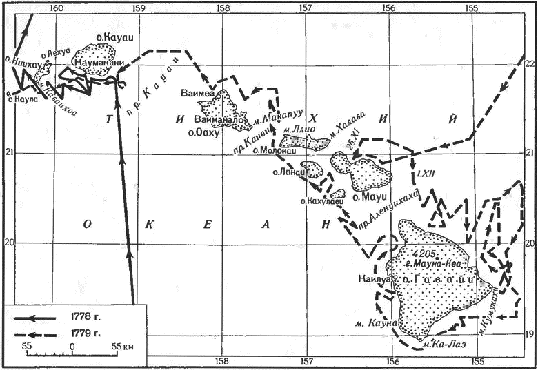 Лето подходило к концу, и Кук решил не предпринимать попыток поисков прохода. 29 августа он подошел к северному берегу Чукотки у мыса Северного (с 1935 г. мыс Шмидта, у 179°30' з.д.), выполнив широтное пересечение Чукотского моря, и оттуда повернул на юго-восток вдоль побережья. Вновь пройдя через Берингов пролив, на этот раз близ берегов Чукотки, Кук спустился к югу приблизительно до 64° с.ш. и круто повернул на восток. 7 сентября суда достигли Америки восточнее о. Следж (у 166° з.д.). До 19 сентября при ясной погоде Кук обходил со съемкой выявленный им обширный залив Нортон с бухтой Нортон и рядом мелких островов, но не смог подойти к его южному берегу из-за отмелей. Вода там была мутная, грунт иловатый, из чего Кук сделал правильный вывод, что на этом участке в залив впадает «значительная река» (Юкон). Общая протяженность открытой им береговой линии Америки составила почти 1 тыс. км (правда, часть северного берега залива Кук обнаружил вторично — после И. Федорова и М. Гвоздева). От залива суда прошли на запад, коснулись о. Св. Лаврентия и 2 октября прибыли к о. Уналашка, где простояли до 26 октября. Здесь Кук встретился с русским мореходом Г.Г. Измайловым, не делавшим секрета из того, что он знал о северной части Тихого океана. Кук получил от него много полезных для себя сведений: Измайлов исправил ряд ошибок в составленных Куком картах, внес некоторые добавления в картах, доставленных англичанами с родины, и разрешил скопировать две русские карты Охотского и Берингова морей. На Уналашке Кук узнал, что в Петропавловске мало съестных припасов и они очень дороги. Но главная причина выбора места зимовки на Гавайях заключалась в другом: «…я совершенно не желал проводить в бездействии шесть или семь месяцев… [неизбежном] в этих северных местах». Затратив на переход ровно месяц, 26 ноября англичане открыли о. Мауи (1885 км2, с вершиной 3055 м) и к западу от него о. Молокаи, а 30 ноября 1778 г. впервые высадились на большую землю к юго-востоку от Мауи. После исследования, затянувшегося до середины января 1779 г., Кук убедился, что в центре Тихого океана примерно между 19 и 22° с.ш.[162], он открыл большой архипелаг, а о. Гавайи, лежащий в основном к югу от 20° с.ш., — крупнейший и самый высокий из этих Сандвичевых о-вов (10400 км2, вершина Мауна-Кеа — 4205 м). Островитяне приняли Кука как божество, против чего он нисколько не возражал. Однако служение новому «богу» оказалось для верующих еще тяжелее, чем старым богам: он требовал слишком много продуктов для своих людей, нарушал строгие запреты (табу), а по обычному правилу такие нарушители карались смертной казнью. В ночь на 14 февраля 1779 г. Кук узнал, что жители увели шлюпку. Он приказал захватить все гавайские лодки, стоявшие в гавани, а утром высадился на берег с отрядом в 10 человек, арестовал старого вождя с сыновьями и повел к шлюпке. В это время матросы с других шлюпок обстреляли уходившую пирогу и убили одного из находившихся там людей (по-видимому, знатного). Тогда гавайцы, толпой следовавшие за арестованным вождем, отослали женщин и детей и вооружились дротиками и камнями. Кук первый выстрелил в одного воина, офицер убил ударом приклада другого, капитан выстрелил в третьего. Островитяне кинулись на англичан и убили Кука и нескольких его спутников. По позднейшим сообщениям, при этом пало 30 гавайцев, в том числе шесть вождей. Нападавшие разру