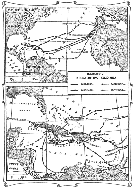 К западу (у 84° з. д.) море сильно обмелело, и Колумб решил возвращаться: суда давали течь, матросы роптали, провизия была на исходе. Под присягой почти от каждого члена экипажа 12 июня 1494 г. он получил показания, что Куба — часть континента и, следовательно, дальше плыть бесполезно: острова такой длины существовать-де не могло. В действительности же адмирал находился почти в 100 км от мыса Сан-Антонио, западной оконечности о. Куба. Общая длина открытого им южного кубинского побережья составила около 1700 км. Повернув на восток, Колумб обнаружил большой о. Эванхелиста (Пинос[14], 3056 км2) и простоял там около двух недель, чтобы дать отдых людям. С 25 июня по 18 июля он шел на юго-восток через то же усеянное островами море к мысу Крус. «При этом особенно досаждали ему ливни, которые обрушивались на корабли каждый вечер». После отдыха на мысе Крус он пытался идти прямо на Эспаньолу, но из-за противных ветров вынужден был 22 июля вернуться к Ямайке. Он обогнул с запада и юга «эту зеленую, прекрасную и счастливую землю… За кораблями следовали бесчисленные каноэ, и индейцы служили христианам, давая им еду, словно пришельцы были их родными отцами… Однако каждый вечер бури и ливни донимали команды кораблей». К счастью, 19 августа установилась хорошая погода, и на следующий день Колумб пересек пролив Ямайка и подошел к юго-западному выступу Эспаньолы. 40 дней он обследовал побережье этого острова, еще не посещенное испанцами, и только 29 сентября вернулся в г. Изабеллу, истомленный и тяжело больной. Болел он пять месяцев.Покорение Эспаньолы
