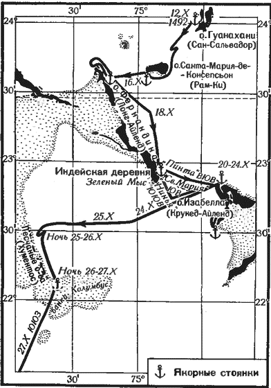 3 августа 1492 г. Колумб вывел корабли из гавани Палоса. У Канарских о-вов обнаружилось, что «Пинта» дала течь. Из-за ее ремонта только в сентябре 1492 г. флотилия отошла от о. Гомеры. Первые три дня был почти полный штиль. Затем попутный ветер повлек корабли на запад, и так быстро, что моряки вскоре потеряли из вида о. Йерро. Колумб понимал, что тревога моряков будет расти по мере удаления от родины, и решил показывать в судовом журнале и объявлять экипажу преуменьшенные данные о пройденных расстояниях, верные же заносить в свой дневник[5]. Уже 10 сентября в дневнике отмечено, что за сутки пройдено 60 лиг (около 360 км), а исчислено 48, «чтобы не наводить на людей страх»{4}. Подобными записями пестрят и дальнейшие страницы дневника. 16 сентября «начали замечать множество пучков зеленой травы, и, как можно было судить по ее виду, трава эта лишь недавно оторвана от земли». Однако флотилия три недели продвигалась на запад через это странное водное пространство, где иногда было «столько травы, что, казалось, все море кишело ею». Несколько раз бросали лот, но он не достигал дна. В первые дни суда, увлекаемые попутными ветрами, легко скользили среди водорослей, но затем в штиль почти не продвигались вперед. Так было открыто Саргассово море. В начале октября матросы и офицеры все настойчивее требовали переменить курс: до этого Колумб неуклонно стремился прямо на запад. Наконец 7 октября он уступил, вероятно, опасаясь мятежа, и повернул на запад-юго-запад. Прошло еще три дня, и «люди теперь уже не могли больше терпеть, жалуясь на долгое плавание». Адмирал немного успокоил матросов, убедив их, что они близки к цели, и напомнил, как далеки от родины. Он уговаривал одних и обещал награды другим. 11 октября все свидетельствовало о близости земли. Сильное возбуждение охватило моряков. В 2 ч пополуночи 12 октября 1492 г. Родриго Триана, матрос «Пинты», вдали увидел землю. Утром открылась земля: «Этот остров очень большой и очень ровный, и здесь много зеленых деревьев и воды, а посередине расположено очень большое озеро. Гор же никаких нет». 33 дня длился первый переход через Атлантический океан в субтропической зоне от Гомеры к этому острову. С кораблей спустили лодки. Колумб с обоими Пинсонами, нотариусом и королевским контролером высадился на берег — теперь уже как адмирал и вице-король, — водрузил там кастильское знамя, формально вступил во владение островом и составил об этом нотариальный акт.