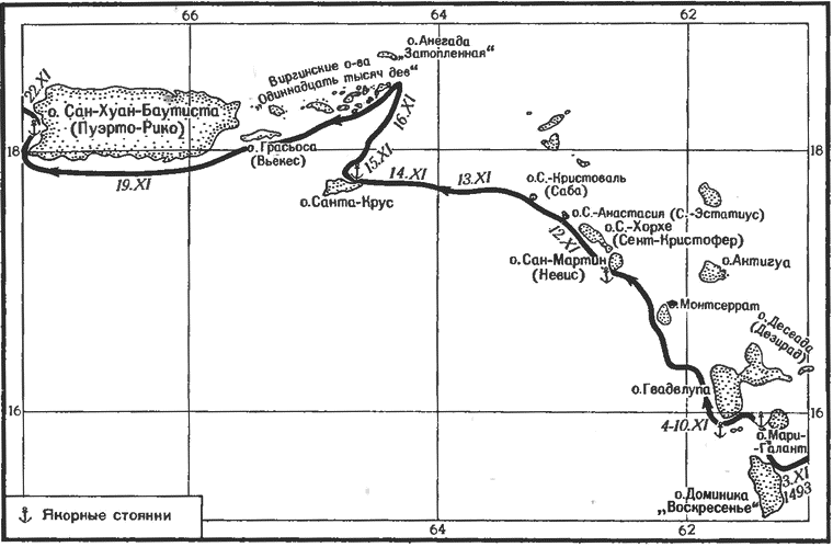 От Канарских о-вов Колумб взял курс на юго-запад: жители Эспаньолы указывали, что к юго-востоку от них есть «земли карибов, пожирателей людей», и «острова безмужних женщин», где много золота. Путь кораблей пролегал приблизительно на 10е южнее, чем во время первого плавания. Курс был взят исключительно удачно: Колумб поймал попутный ветер — северо-восточный пассат и пересек океан в 20 дней. Этим путем стали пользоваться суда, идущие из Европы в «Западную Индию». 3 ноября показался гористый, покрытый лесом остров. Открытие произошло в воскресенье (по-испански «доминика»), и Колумб так его и назвал. Удобной гавани там не оказалось, и адмирал повернул на север, где заметил малый низменный остров (Мари-Галант), на который и высадился. Недалеко были видны другие острова. 4 ноября Колумб направился к наибольшему из них, названному Гваделупой. Там испанцы провели восемь дней, много раз высаживались на берег, осматривали селения, заходили в жилища. «В домах мы нашли множество человеческих костей и черепов, развешанных, точно посуда, для разных надобностей. Мужчин мы видели здесь немного: как нам объяснили женщины, большая часть их ушла на десятках каноэ грабить… острова. Люди эти нам показались более развитыми, чем обитатели других островов… Хоть у них и соломенные жилища, но построены они добротнее… в них больше утвари… У них много хлопка… и немало покрывал из хлопчатой ткани, выработанных так хорошо, что они ничуть не уступают нашим кастильским»[10].