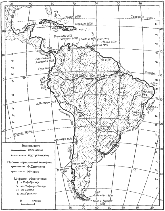 Флотилия двинулась отсюда на северо-запад. Дойдя до устья какой-то мелководной реки, Пинсон выслал вверх четыре лодки. На берегу он столкнулся с нагими индейцами. Начался бой. Восемь испанцев было убито, остальные на трех лодках спаслись. Продолжая путь на северо-запад, моряки через несколько дней потеряли из виду землю. Когда же они зачерпнули воду, то она оказалась годной для питья. Они повернули к берегу, но достигли его, лишь пройдя около 200 км. Так вторично после Веспуччи было открыто устье многоводной р. Пара (правый устьевой рукав Амазонки). За рекой па низменных островах Маражо и других жили нагие, раскрашивавшие свое тело и лицо индейцы. Они очень дружелюбно отнеслись к пришельцам, а те захватили 36 человек для продажи в рабство. V самого экватора Пинсон обнаружил — и вновь после Веспуччи — устье гигантской р. Амазонки. Ее воды превращали часть океана близ устья в «Пресное море» (Мар-Дульсе — название, данное Пинсоном). Моряки, пользуясь примитивным прибором, обнаружили против островов дельты соленую воду на глубине около 12 м. Продвигаясь от устья Амазонки вдоль берега на северо-запад, Пинсон достиг Гвианы, уже посещенной, чего он не знал, Охедой. До этого района он проследил с перерывом около 3 тыс. км северного берега нового континента, в том числе открыл участок длиной 1200 км, и решил, что такая протяженная береговая линия может принадлежать только континенту, но неверно принял его за Азию. Затем Пинсон прошел еще дальше на северо-запад, в начале апреля обнаружил дельту другой огромной реки (Ориноко) и не очень оригинально окрестил ее Рио-Дульсе. Флотилия пересекла залив Пария, направилась к Эспаньоле вдоль цепи Малых Антильских о-вов и по пути наткнулась на остров, названный Пинсоном Майским, — вероятно, о. Гренада. На новых землях он не нашел никаких источников дохода и пошел к Багамским о-вам — за рабами. На пути туда во время урагана погибли два судна. Уцелевшие два корабля вернулись 29 сентября 1500 г. в Палое с 20 рабами и ничтожным грузом бразильского дерева. В результате Пинсон разорился и кредиторы начали против него процесс, который тянулся несколько лет. В середине декабря 1499 г. из Палоса вышли на юго-запад два корабля экспедиции Диего Лепе, в качестве главного навигатора в ней принимал участие Бартоломе Рольдан. 12 февраля они подошли к восточному выступу Южной Америки близ 5°30' ю. ш. и продвинулись к югу до мыса Сант-Аугустин (мыс Кабу-Бранку, у 7° ю. ш., самый восточный пункт материка). Испанцы прошли на юг, открыли около 200 км побережья и выяснили, что оно простирается дальше на юго-запад. Не найдя здесь ничего ценного, Лепе и Рольдан повернули к северу и северо-западу, повторив путь Пинсона, и занялись охотой за рабами на островах дельты Амазонки. Но наученные горьким опытом после знакомства с Пинсоном, индейцы оказали такое сопротивление, что Лепе отступил, потеряв убитыми 11 человек. Экспедиция впервые поднялась по Амазонке на 400 км (апрель 1500 г.), а затем проследовала к заливу Пария, где с оружием в руках ее вновь встретили индейцы, но на этот раз победили испанцы. Они загрузили свои суда рабами и продали их в Испании, куда прибыли в конце июля 1500 г. Открытое ими восточное побережье материка Рольдан нанес на карту и приложил к отчету Лепе. Тотчас же по возвращении Рольдан был включен — и снова в качестве главного штурмана — в сос