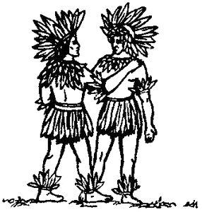 На острове испанцы увидели нагих людей. И Колумб так описывает первую встречу с араваками, народом, через 20—30 лет совершенно истребленным колонизаторами: «Они вплавь переправлялись к лодкам, где мы находились, и приносили нам попугаев, и хлопковую пряжу в мотках, и дротики, и много других вещей, и обменивали все это… Но мне показалось, что эти люди бедны… Все они ходят в чем мать родила. И все люди, которых я видел, были еще молоды… и сложены они… хорошо, и тела и лица у них очень красивые, а волосы грубые, совсем как конские, и короткие… (а кожа у них такого цвета, как у жителей Канарских островов, которые не черны и не белы…). Одни из них разрисовывают лицо, другие же — все тело, а есть и такие, у которых разрисованы только глаза и нос. Они не носят и не знают [железного] оружия: когда я показывал им шпаги, они хватались за лезвия и по неведению обрезали себе пальцы. Никакого железа у них нет». На острове Колумбу подарили «сухие листья, которые особенно ценились жителями»: первое указание на табак. Индейцы называли свой остров Гуанахани, адмирал дал ему христианское имя — Сан-Сальвадор («Святой спаситель»), которое закрепилось за одним из Багамских о-вов, лежащим на 24° с. ш. и 74° 30' з. д., — ныне о. Уотлинг. Колумб обратил внимание на кусочки золота в носу у некоторых островитян. Золото якобы доставалось откуда-то с юга. С этого момента он не устает повторять в дневнике, что «найдет золото там, где оно родится». Испанцы на лодках за два дня обследовали западное и северное побережье о. Гуанахани и обнаружили несколько селений. Вдали виднелись другие острова, и Колумб убедился, что открыл архипелаг. Жители посещали корабли на челнах-однодеревках разной величины, поднимавших от одного до 40— 45 человек[6]. Чтобы найти дорогу к южным землям, где «родится золото», Колумб приказал захватить шесть индейцев. Пользуясь их указаниями, он постепенно продвигался на юг.