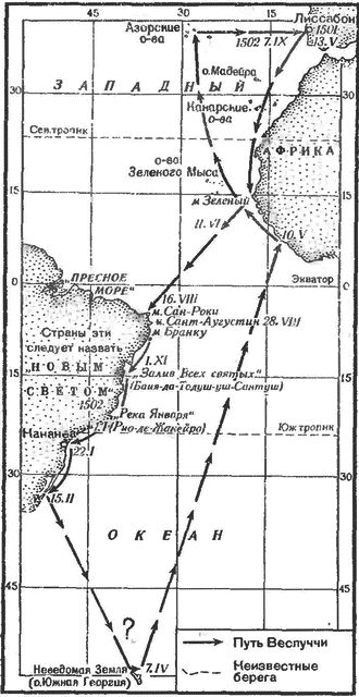 На открытие Кабрала Мануэл I отреагировал весьма оперативно. В 1500 г. он уведомил об этом других монархов, переименовав «Вера-Круш» в «Санта-Круш»: «Земля Святого Креста очень удобна и необходима для сообщения с Индией, так как он [Кабрал] отремонтировал там свои корабли и забрал воду» (М. Наваррете). А в 1501 г. король снарядил вторую португальскую экспедицию к берегам неведомой земли. Капитан-генералом флотилии из трех каравелл Мануэл I назначил искусного мореплавателя Гонсалу Куэлью с поручением продолжить открытие берегов Южного материка, выяснить, какие товары можно получить оттуда и как «прижать к с гене», т. е. обойти, Тордесильясский договор. Америго Веспуччи, перешедший к 1501 г. на португальскую службу, был приглашен в качестве полуофициального навигатора и получил задание описать ход «первой исследовательской экспедиции в Бразилии». Это становится ясным из его писем[24] — единственного, хотя и не очень надежного, источника — и из ряда дошедших до нас карт начала XVI в., на которых нанесена часть берега Бразилии с надписями «Санта-Круш» или «страна попугаев» и с названиями нескольких рек, мысов и заливов. К счастью для историков, португальцы, как и испанцы, давали новооткрытым объектам, как правило, имена по католическим святцам. Учитывая это и сопоставляя очень скудные данные писем Веспуччи со старейшими картами Бразилии, историки определили ход открытия португальцами береговой линии Южного материка в 1501—1502 гг. Итак, 10 мая 1501 г. три корабля под началом Гонсалу Куэлью, при участии Америго Веспуччи, оставили Лиссабон. 1 июня у Зеленого Мыса они встретили Кабрала, возвращавшегося домой. У архипелага Бижагош они 11 дней пополняли запасы пресной воды и древесины. Отсюда флотилия двинулась на юго-запад и после длительного перехода, в течение которого почти пять недель погода была очень бурной, коснулась скалистого острова — скорее всего, о. Фернанду-ди-Норонья[25], а 17 августа оказалась у берега какой-то большой земли. У первого бразильского мыса корабли простояли только неделю, хотя экипажу требовался отдых, а судам ремонт; кратковременность стоянки объяснялась тем, что без вести пропали два матроса, сошедшие на берег для торгового обмена, — их ожидали и разыскивали; на глазах испанцев индейцы убили молодого моряка, направленного для налаживания контактов. Куэлью отказался — к негодованию Веспуччи — от карательной операции и двинулся к югу, причем все отрезки пути флотилии между 5 и 25° ю. ш. укладываются в точные хронологические рамки благодаря католическим святцам — ниже в скобках указывается день того или иного святого. Самый северный обозначенный на картах начала XVI в. пункт, которого коснулась в 1501 г. экспедиция, — мыс Сан-Роки (17 августа, у 5°30' ю.ш.). Он находится на восточном выступе материка, открытом в феврале — апреле 1500 г. испанцами Пинсоном и Лепе. Бесспорно, — даже для того времени, что он находился к востоку от демаркационной линии 1494 г., и, следовательно, должен был принадлежать Португалии. Вот почему экспедиция 1501 г. подошла к бразильскому берегу не у Портусегуру (16°25' ю. щ.), а гораздо севернее, на 11° ближе к экватору. Португальцы вовсе и не думали тогда об уже открытом в 1500 г. за 16° ю. ш. «острове», берег которого Кабрал проследил всего лишь на 60 км. Ведь уже осенью 1500 г. Пинсон и Лепе — это документально доказано — вернулись в