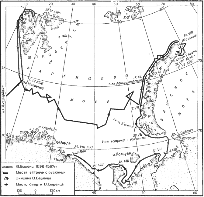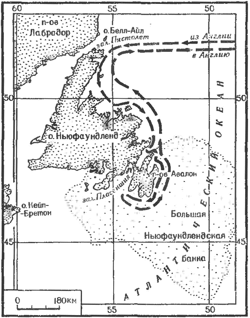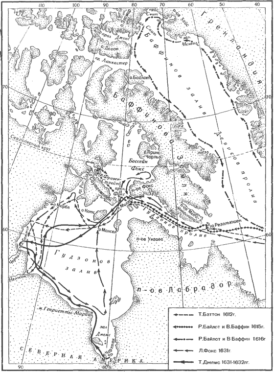 26 марта 1616 г. на том же «Дискавери» с командой в 17 человек Байлот и Баффин вышли на поиски Северо-Западного прохода со стороны Девисова пролива. 5 июля они достигли 78 с. ш. До середины XIX в. ни одно судно в этой части Атлантики не заходило так далеко на север, не считая норманнов. Вторично после них моряки «Дискавери» открыли западное побережье Гренландии между 72 и 76° с. ш., залив Мелвилл, северо-западный выступ Гренландии между 76 и 78° с. ш. (теперь п-ов Хейс) и южный вход в пролив Смит, отделяющий с северо-запада этот полуостров от Земли Элсмира (название дано позднее). В узком месте пролива лед в начале июля был непроходим, и Байлот повернул на юг. У Земли Элсмира они обнаружили залив Смит, а южнее, за выступом (v 76° с ш) забитый льдом вход в пролив Джонс (между о-вами Элсмир и Девон). Еще южнее (у 74° 30' с. ш.) открылся очень широкий, но опять-таки забитый льдом вход в пролив Ланкастер (между о-вами Девон и Байлот). Байлот продолжал путь теперь уже на юго-восток и шел так до полярного круга около 1000 км по направлению берега огромной земли: ее с того времени называют — в честь ученого, красноречивого и владеющего пером штурмана — Баффиновой Землей[200]. Ни сам Баффин, ни Байлот ни разу не высаживались на эту землю: от пролива Ланкастер судно шло на некотором расстоянии от берега, огражденного широкой полосой неподвижного льда. Многие моряки болели цингой, и Байлот у полярного круга) повернул на юго-восток, а 30 августа привел судно в Англию.) Баффин точно закартировал все берега «своего» залива, но открытия экспедиции в Англии были приняты как фантастика и позже сняты с карт. Такая несправедливость продолжалась до 1818 г., когда Джон Росс вновь не открыл Баффинов залив. Баффину приписывают в одно и то же время и открытие «ворот» к двум проливам, действительно ведущим в Тихий океан, и закрытие этих «ворот». Подлинная честь открытия, как видно из рассказа об экспедиции, должна быть поделена между полузабытым капитаном Байлотом и его удачливым штурманом, чьим именем назван не только громадный остров, но и полузамкнутое море, расположенное между Гренландией и Баффиновой Землей, по площади гораздо больше Балтийского, — Баффинов залив. Сомнительная честь закрытия приполярных западных «ворот», несомненно, принадлежит одному Баффину: сохранилось его письмо к знатному покровителю экспедиции, где он прямо говорит, что «нет ни прохода, ни надежды на проход в северной части Девисова пролива», т. е. в Баффиновом заливе. Ему поверили: «Компания лондонских купцов Северо-Западного прохода» была ликвидирована.Экспедиции Мунка, Фокса и Джемса