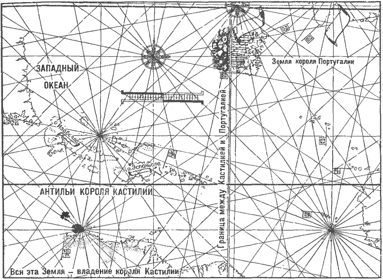 Весть об открытии Колумбом «Западной Индии» встревожила португальцев. По их мнению, были нарушены права, предоставленные Португалии римскими папами (Николаем V и Каликстом III) в 1452 — 1456 гг., права, признанные самой Кастилией в 1479 г., подтвержденные папой Сикстом IV в 1481 г., — владеть землями, открытыми к югу и востоку от мыса Бохадор, «вплоть до индийцев». Теперь Индия, казалось, ускользала от них. Кастильская королева и португальский король отстаивали свои права на земли за океаном. Кастилия опиралась на право первого открытия, Португалия — на папские пожалования. Разрешить спор мирным путем мог лишь глава католической церкви. Папой тогда был Александр VI Борджия. Вряд ли португальцы считали этого папу, испанца по происхождению (Родриго Борха), беспристрастным судьей. Но они не могли не считаться с его решением. 3 мая 1493 г. папа буллой Jnter cetera («Между прочим») произвел первый раздел мира, предоставив Кастилии права на земли, которые она открыла или откроет в будущем, — «земли, лежащие против западных частей на океане» и не принадлежащие какому-либо христианскому государю. Иными словами, Кастилия на западе получила такие же права, какие имела Португалия на юге и востоке. 4 мая 1493 г. в новой булле (вторая Jnter cetera) папа пытался точнее определить права Кастилии. Он даровал в вечное владение кастильским королям «все острова и материки… открытые и те, которые будут открыты к западу и югу от линии,проведенной… от арктического полюса… до антарктического полюса… [Эта] линия должна отстоять на расстоянии 100 лиг к западу и к югу от любого из островов, обычно называемых Азорскими и Зеленого Мыса». Ясно, что границу, установленную второй буллой, на карте невозможно провести. Уже тогда твердо знали, что Азоры лежат гораздо западнее о-вов Зеленого Мыса. А выражение «к югу от линии, проведенной… от… полюса… до полюса», т. е. к югу от меридиана, просто нелепо. Тем не менее папское решение легло в основу испано-португальских переговоров, закончившихся Тордесильясским договором от 7 июня 1494 г. Португальцы уже тогда сомневались, что Колумб достиг Азии, и не настаивали, чтобы испанцы совсем отказались от заокеанских плаваний, но добивались лишь переноса «папского меридиана» дальше к западу[9].