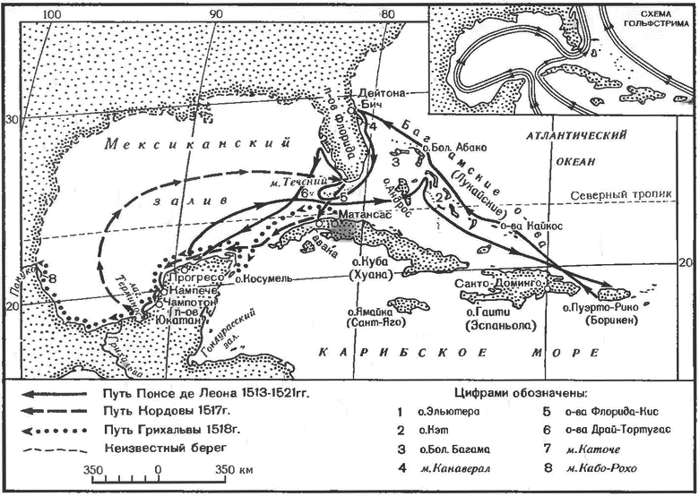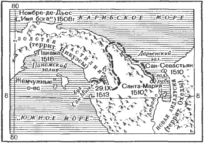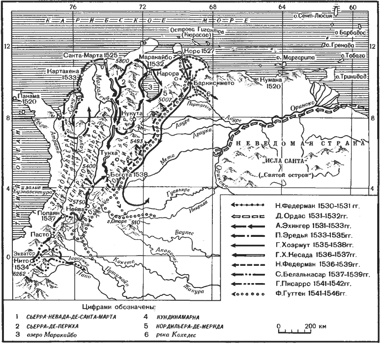 6 февраля 1500 г. экспедиция отправилась домой. Сначала Ниньо шел вдоль берега на восток до п-ова Пария, а затем взял курс на северо-восток и достиг родины 8 апреля 1500 г. Никогда еще в Испанию не поступала одновременно такая масса жемчуга, ни одно заморское испанское предприятие XV в. не обогатило так его инициаторов и участников. Поэтому экспедиция Ниньо — Герры дала сильный толчок к организации других частных предприятий «для открытий». Немного раньше Ниньо разрешение на открытия на западе получил Алонсо Охеда, участник второго плавания Колумба. Этот красивый, жестокий и жадный идальго смог снарядить лишь одно судно, средства для экипировки двух других кораблей ему дали флорентийские банкиры. Этим, видимо, объясняется, что с А. Охедой отправился приказчик банкирской конторы флорентиец Америго Веспуччи. Был приглашен также баск Хуан Ла Коса и другие участники второго плавания Колумба. Сам Охеда видел карту залива Пария и Жемчужного берега, посланную Колумбом королям в 1498 г. Экспедиция вышла из Кадиса 18 мая 1499 г., где-то в пути Охеда захватил каравеллу, и часть ее команды согласилась идти с ним. Уже в конце июня четыре корабля достигли нового материка у 6 или 5° с. ш., а может быть у 4° (бухта Ояпок, 51° з. д.), и здесь разделились. Веспуччи на двух судах остался (см. гл. 9), а Охеда на двух других двинулся к западо-северо-западу. Он проследил 1200 км побережья Гвианы и Венесуэлы до дельты Ориноко и вышел через открытые Колумбом проливы в Карибское море. Переход этот отнял столько времени, что Охеда следовал вдоль Жемчужного берега на две-три недели после Ниньо, о чем оба не знали. Это обстоятельство сильно отразилось на финансовых результатах экспедиции Охеды: где его предшественники получали груды жемчуга, он собрал несколько жемчужин. Близ мыса Кодера суда Охеды и Веспуччи соединились. За мысом Кодера тянулись сначала плоские, а на протяжении 200 км далее к западу гористые, никем еще не разведанные берега — Охеда и Веспуччи открыли восточную часть Карибских Анд. Страну населяли «негостеприимные» индейцы гуяно, которые, как правило, отказывались давать золото и жемчуг в обмен на европейские «товары», из-за чего часто происходили стычки. Одна из них у приморского селения с забавным названием Чичиривиче (у 68º 20' з. д.) едва не стала последней в жизни высадившихся испанцев: индейцев оказалось так много, что пришельцы дрогнули. Но один из испанцев, 55-летний ветеран, повел их за собой — туземцы не выдержали натиска и рассеялись, оставив 150 убитых, потери испанцев составили один убитый и 21 раненый. В ожидании, пока они поправятся, Охеда простоял здесь 20 дней, а затем продвинулся к северу и открыл холмистый «остров Гигантов» (Кюрасао), населенный рослыми индейцами и богатый бразильским деревом. Западнее он обнаружил невысокий и узкий о. Аруба, с жилищами на сваях. Применив оружие, люди Охеды ворвались в дома, захватили много раскрашенной одежды из хлопка и без потерь вернулись на суда. Многолюдный поселок на воде, состоявший из таких же свайных построек, они увидели и на холмистом п-ове Парагуана, северный мыс которого Охеда и Веспуччи окрестили Кабо-де-Сан-Роман — в честь святого (9 августа 1499 г.), это имя мыс у 70° з. д. носит и ныне. Обширный залив к западу Охеда назвал Венесуэла — в честь «царицы Адриатики» (по-испански «Венесуэла» значит «маленькая Венеция», 