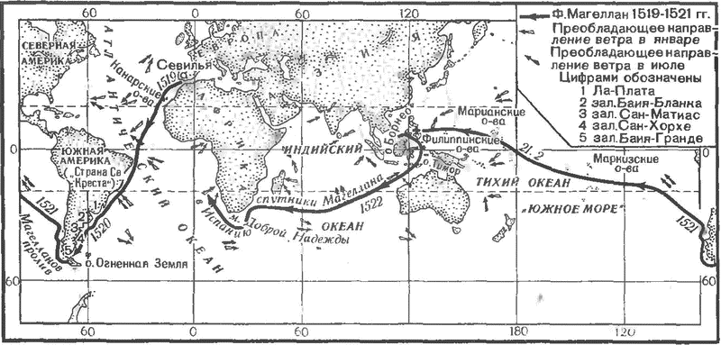 «21 апреля, когда мы находились… в 660—670 лигах от острова Сан-Николау, — писал 1 мая 1500 г. из Портусегуру (Бразилия) на родину участник экспедиции Веру Ваш Каминья, — появились признаки земли, большое количество длинной и всякой другой травы…» Через день подошли к земле, которую Кабрал назвал «островом Вера-Круш» (Истинного креста). Близ берега виднелась «высокая, круглая гора, а к югу — другие, более низкие горы и равнина, покрытая большими деревьями». День был пасхальный, и Кабрал назвал высокую гору Пас куал («Пасхальная», 536 м); находится она западнее мыса Корумбан, у 17° ю. ш. Сан Николау лежит у 16°37' с. ш. Следовательно, корабли, двигаясь прямо на юг, должны были пройти до широты горы Паскуал на 33°30', что составляет более 3700 км. По отсчету штурманов, как сообщает П. Каминья, эскадра преодолела около 4000 км. Но тогда не может быть и речи о том, что Кабрал сначала шел на юг, до 17° ю. ш., а затем круто повернул на запад, «словно в поисках какого-то известного пункта». При таком предположении — а его делают защитники португальского приоритета — корабли должны были пройти 3700 км по меридиану и 1600 км по параллели, а всего 5300 км. На две-три сотни километров они, конечно, могли ошибиться, но невероятна ошибка на 1300 км. А из этого следует вывод: не было никакого крутого поворота «почти под прямым углом» — корабли следовали южным курсом, а течением их сносило на запад, пока не появилась земля. Открытие португальцами Бразилии 22 апреля 1500 г. было делом счастливого случая. Правда, в Португалии к моменту выхода в море эскадры Кабрала, вероятно, уже знали об открытии Колумбом в 1498 г. большой земли, лежащей к западу от Тринидада. Но она находилась в северном полушарии, более чем в 3000 км от того пункта южного полушария, к которому португальцы подошли 22 апреля 1500 г., и ее открытие не повлияло на ход плавания Кабрала. О достижениях других испанских экспедиций, открывших в 1499 —1500 гг. большие участки побережья Южной Америки, даже слухи не могли еще достигнуть Португалии. И все-таки некоторые португальские и бразильские историки утверждают: организаторы и руководители экспедиции Кабрала твердо знали, что заатлантический Южный материк существует; к нему до Колумба уже якобы плавали португальские корабли. Этим историкам оставалось только подыскать подходящих «первооткрывателей» Южной Америки, по возможности прославленных, начиная с Мартина Бехайма, на португальской службе. На глобусе Бехайма от 1492 г. нет никаких признаков заатлантического Южного материка. До этого года он, как достоверно известно, плавал только в Восточной Атлантике. Но, вероятно, с середины 90-х гг. XV в. Бехайм снова поселился на Азорских о-вах, неизвестно чем занимаясь. Следовательно, рассуждают «историки», он мог плавать на запад — конечно, только на португальских кораблях, а если плавал, то мог достигнуть Америки, и не только Северной, но и Южной. На таком малоубедительном основании они делают предположение, что Бехайм знал побережье Америки от Флориды до Бразилии включительно еще до 1498 г. Вместе с анонимными капитанами португальских кораблей Бехайм выступает как предшественник Колумба в деле открытия Южной Америки и как информатор Кабрала о Бразилии{6}. Редчайшим исключением, когда удалось подыскать подходящее имя для капитана португальского корабля, была предполагаемая экспедиция Дуарти Пашек