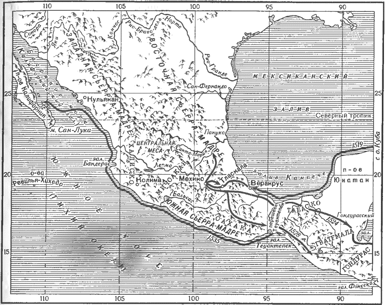 9 марта 1500 г. из Лиссабона в Восточную Индию вышла большая торгово-военная экспедиция на 13 кораблях (мы не знаем их типа и тоннажа) с экипажем около 1500 человек, из них более 1000 «отборного и хорошо вооруженного люда». Цель ее — установить торговые отношения с Индией по возможности мирными средствами, но «…не прекращать, несмотря на любое сопротивление, это предприятие». Главнокомандующим эскадры («капитанмор») Мануэл I назначил Ведру Алвариша Кабрала, ранее ничем себя не проявившего ни в военном, ни в мореходном деле. 22 марта эскадра, потеряв один корабль, двинулась от Сан-Нико-лау — центрального острова архипелага Зеленого Мыса — прямо на юг, пересекла экватор, а затем отклонилась на запад и у 17° ю. ш. подошла 22 апреля 1500 г. к берегу Бразилии. Меридиан о. Сан-Николау приблизительно 24° з. д., меридиан конечного пункта (вероятнее всего бразильский мыс Корумбан) — 39° з. д. Следовательно, во время перехода эскадра сдвинулась на запад от намеченного, южного курса на 15° долготы, что на широте мыса Корумбан составляет около 1600 км. Нарочно или случайно, вольно или невольно Кабрал отклонился так далеко на запад? Капитан одного из судов — Бартоломеу Диаш советовал ему держаться в южном полушарии подальше от африканского берега. Есть известие, будто и Гама, ссылаясь на личный опыт, предлагал Кабралу избегать гвинейских берегов и следовать от о-вов Зеленого Мыса прямо на юг, пока не достигнешь широты мыса Доброй Надежды. Идя таким курсом, корабли Кабрала пересекли три морских течения: Северное Пассатное, относившее их к западу, Экваториальное противотечение, затем Южное Пассатное течение (снова — к западу), и наконец они увлечены были Бразильским течением на юго-запад.