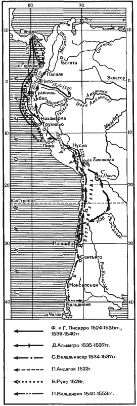 Ход открытия побережья Южной Америки испанцами и португальцами (1498—1541 гг., по В. И. Магидовичу).