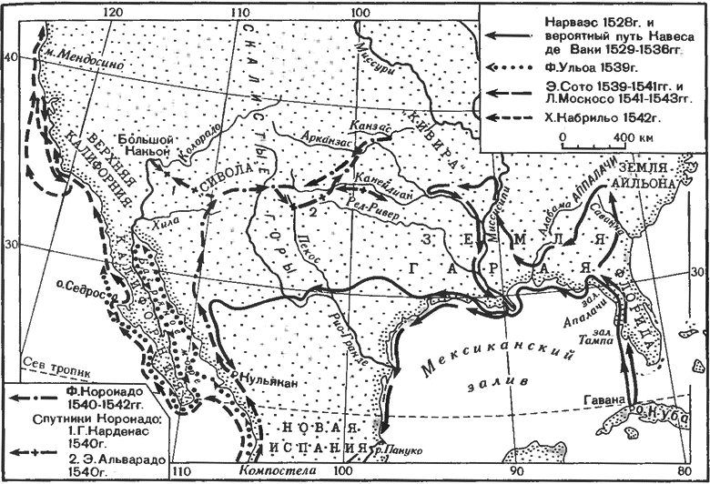 Возвращаться через Магелланов пролив было опасно: Дрейк боялся, что там его ждут испанцы[194], и решил вернуться домой вокруг Северной Америки. Он привел в порядок «Золотую лань», запасся топливом, водой и двинулся на северо-запад, вдоль тихоокеанского берега Мексики. Там он не нападал на портовые города, а грабил только поселки. От Мексики он пошел дальше на север. Когда англичане в июне поднялись до 42° с. ш., они испытали внезапный переход от жары к холоду: падал мокрый снег, снасти обледенели, часто налетали шквалы. В тихую погоду надвигались густые туманы, из-за которых приходилось стоять на месте. Две недели ни по солнцу, ни по звездам нельзя было определить положение корабля. «Когда мы приближались к берегу, мы видели голые деревья и землю без травы, и это в июне и в июле… Берег неизменно отклонялся к северо-западу, как будто шел на соединение с Азиатским материком… Нигде не видели мы следов пролива… Тогда решено было спуститься в более теплые широты: мы находились под 48°, и десять градусов, пройденные нами, перенесли нас в прекрасную страну с мягким климатом». Тихоокеанский берег Северной Америки начинает «неизменно отклоняться к северо-западу» у о. Ванкувер (за 48° с. ш.). Именно эту параллель и указал Флетчер. На самом деле там есть пролив — между о. Ванкувер и материком (Хуан-де-Фука). Англичане могли не заметить его из-за тумана или из-за того, что буря в то время отогнала их слишком далеко от берега, по гораздо правдоподобнее, что Дрейк достиг только 42—43° с. ш. (мыс Бланко). Вряд ли такой опытный мореход, как Дрейк, мог допустить ошибку в пять градусов в определении широты, но дело в том, что из-за скверной погоды как раз и не было возможности определить положение корабля.