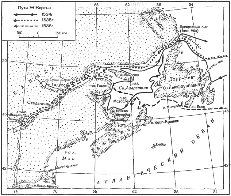 С 1609 по 1615 г. Шамплен почти ежегодно плавал из Франции к р. Св. Лаврентия, где собирал сведения о внутренних областях Северной Америки. Рассказы о море, находившемся где-то на северо-западе или на западе от Квебека, подтверждались сотнями индейцев, с которыми сталкивался Шамплен. (Французы смешивали сообщения о Гудзоновом заливе и Великих озерах.) Три пути, казалось, вели к этому морю, за которым Шамплену грезились Китай и Индия. Но один, северо-западный путь вверх по Сагенею через угрюмые безлюдные области приводил к лабиринту рек и озер, где, как представлялось, бесполезны были самые надежные проводники. Другой шел вверх по Оттаве, третий, юго-западный, — по р. Св. Лаврентия до ее истоков. На поиски Западного моря Шамплен направлял вместе с индейцами своих «юнцов» (молодых колонистов). Среди них выделился Этьен Брюле: 16-летним юношей, не получив никакого образования, в 1608 г. он прибыл в Новую Францию вместе с Шампленом. С 1610 г. Брюле, скупая пушнину, жил в лесах среди индейцев, охотился вместе с ними, переходил от одного племени к другому и научился свободно говорить на различных местных диалектах ирокезского и алгонкинского языков. Это был первый типичный североамериканский лесной бродяга (coureur des bois)[208], имя которого дошло до нас, охотник и скупщик пушнины, неутомимый землеискатель и землепроходец, если употреблять старорусские термины. Летом 1615 г. Шамплен и Брюле выступили на челнах с десятью гребцами-гуронами от Квебека к устью Оттавы, поднялись по ней и ее притоку Маттаве к озеру Ниписсинг, а оттуда по Французской реке (Френч-Ривер) вышли к большому заливу (Джорджиан-Бей) — части озера Гурон. До него, как предполагают, летом 1610 г. доходили Брюле и другой лесной бродяга, а вместе с ними или по их следам — монах Жозеф Ле Карон. От Гурона Шамплен, разлучившись с Брюле, повернул на юго-восток и, открыв в начале сентября озеро Симко, достиг Онтарио и убедился, что именно из его северо-восточного угла вытекает р. Св. Лаврентия. Затем Шамплен прошел на юг, к озеру Онайда, где берет начало порожистая р. Осуиго, впадающая в Онтарио. После стычки с ирокезами он вынужден был отступить и вернулся в Квебек, пройдя в общей сложности около 1600 км. Брюле раньше Шамплена добрался до Онтарио и на челне переправился через озеро. К югу от Онтарио он узнал о стычке Шамплена с ирокезами, собрал 500 гуронов и поспешил на помощь, но пришел к месту уже после отступления Шамплена. Тогда Брюле повернул на юг и дошел до какой-то реки по холмистой лесной местности. Следуя вниз по ее течению, он поздней осенью достиг длинного и узкого морского залива с чрезвычайно изрезанными берегами, в который впадало несколько больших и множество малых рек. Холмистая местность, которую Брюле пересек, — это Аппалачское плато и Аллеганские горы; большая река, течение которой он проследил, — Саскуэханна (около 1000 км); залив — Чесапикский; полоса суши, отделяющая залив от океана, — п-ов Делавэр. Весной 1617 г. отряд Брюле пошел на север, в Квебек. По дороге на него напали ирокезы; гуроны разбежались, удалось скрыться и Брюле, но после нескольких дней блужданий по лесам он, чтобы не умереть с голоду, положился на благородство случайно встреченных ирокезов, слухам о «свирепости» которых, очевидно, сам не очень верил. Ирокезы не только накормили одинокого француза, но дали ему проводника до страны сво