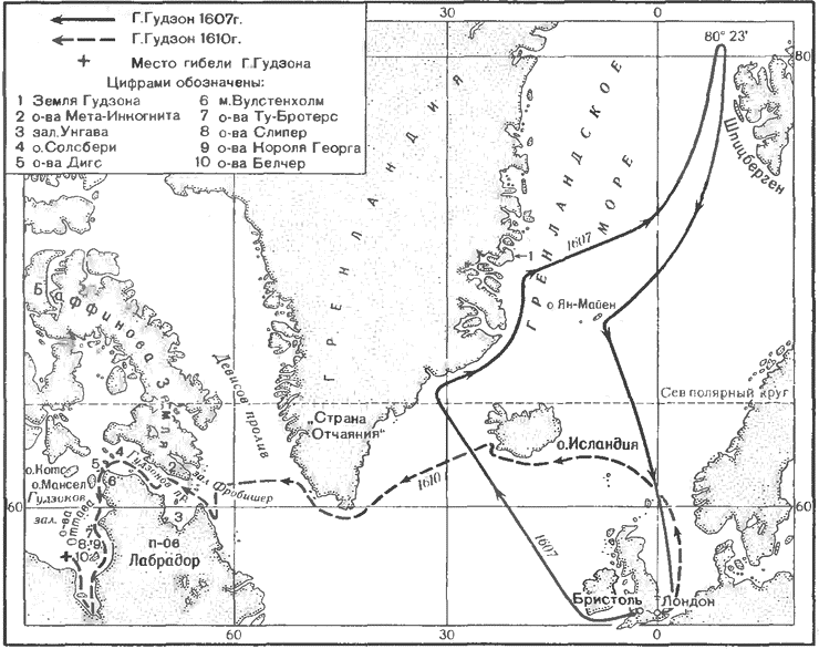 В 1607 г. купцы английской торговой «Московской компании» приняли на службу ранее почти неизвестного пожилого капитана Генри Гудзона, лондонского жителя. За их счет он снарядил парусник в 80 т с командой в 12 человек. На таком судне Гудзон собирался пройти в Японию прямо через Северный полюс. 1 мая 1607 г. Гудзон вышел из устья Темзы и в июне, двигаясь при исключительно благоприятных ледовых условиях вдоль восточного берега Гренландии, достиг у 73° с. ш. того выступа, который позднее был назван Землей Гудзона. Из-за льдов он повернул на северо-восток и в конце июня увидел остров, принятый им, видимо, за Новую Землю. На самом же деле это был Западный Шпицберген, но крайней мере с первой половины XVI в. постоянно посещавшийся русскими поморами, называвшими его Грумант. Он обогнул остров с севера и в середине июля впервые в истории достиг 80° 23 с. ш. Встретив непроходимые льды, Гудзон повернул обратно и у 71° с. ш. открыл небольшой одинокий остров с двумя вершинами, названный им «Зубцами Гудзона». Но он не мог точно определить положение «Зубцов»; через четыре года остров вторично открыл голландский капитан Ян Майен, который дал ему свое имя, закрепившееся на картах. В середине сентября Гудзон вернулся в Лондон. Кроме больших географических достижений, его плавание имело и важное практическое значение: Гудзон подтвердил сведения о богатых возможностях китобойного и зверобойного промыслов в исследованной им части Северного Ледовитого океана, теперь называемой Гренландским морем. И английские и голландские промышленники немедленно воспользовались его указаниями. Но купцы «Московской компании» были недовольны, так как прямое задание — достичь через Северный полюс Японии — не было выполнено (впрочем, на парусном судне оно и не выполнимо). Все-таки купцы в следующем году вторично послали Гудзона в моря Дальнего Востока, на этот раз северо-восточным путем, даже увеличили команду его судна на два человека. В море капитан взял с собой сына; это он делал и в следующих плаваниях. 22 апреля 1608 г. Гудзон вышел из устья Темзы и 26 июня достиг юго-западного берега Новой Земли, но не мог ни обогнуть ее с севера, ни пробиться через Карские Ворота на восток в Карское море и ни с чем 26 августа вернулся на родину.