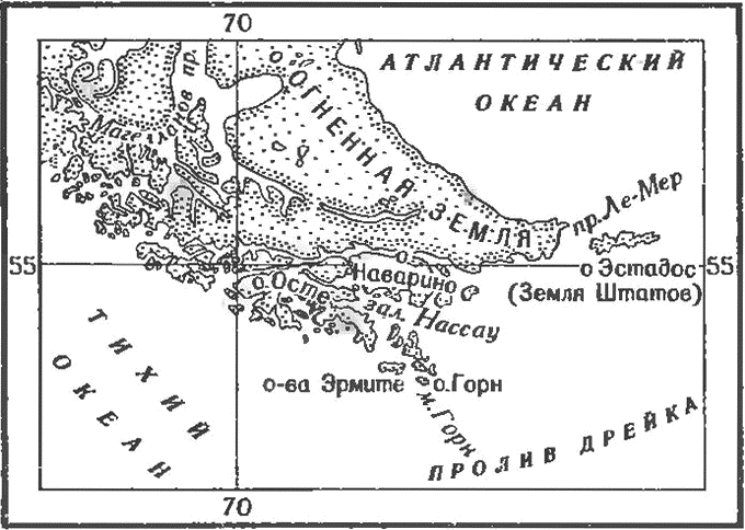 Голландские капиталисты, не связанные с Нидерландской Ост-Индской компанией, не раз пытались прорвать ее торговую монополию и искали новых путей к Молуккам. Одна из таких попыток потерпела полную финансовую неудачу, но привела к важным открытиям в Атлантическом и Тихом океанах. Купцы города Хорн снарядили два судна, пригласив начальником экспедиции опытного капитана Виллема Корнелисзона Схаутена; торговым комиссаром был назначен Якоб Ле-Мер. Экспедиция благополучно пересекла Атлантику, но на последней стоянке у берегов Южной Америки (близ 48° ю. ш.) в конце 1615 г. меньшее судно («Хорн») сгорело; люди перешли на «Эндрахт» («Согласие», 360 т). В середине января 1616 г. Схаутен провел корабль мимо входа в Магелланов пролив: путь через него, как и вокруг мыса Доброй Надежды, был монополией Ост-Индской компании. 24 января, в середине лета, Схаутен увидел гористый, покрытый снегом (на 55° ю. ш.) берег — юго-восточный выступ Огненной Земли, а на востоке — другой высокий берег. Обе земли разделялись «хорошим проливом» — Схаутен назвал его проливом Ле-Мер; он был буквально забит китами: кораблю, чтобы избежать столкновения, приходилось маневрировать. 25 января голландцы вплотную подошли к новой земле и решили, что перед ними — выступ Южного материка. Этот «выступ» они назвали Землей Штатов[218] — в честь Генеральных штатов, высшего законодательного органа Республики Соединенных Провинций. Пройдя пролив Ле-Мер, «Эндрахт» повернул на юго-запад. «Мы встретили, — пишет Схаутен, — сильную волну и ярко-синюю воду, которая вселила в нас уверенность, что мы находимся в Великом Южном море. Это нас очень обрадовало, так как мы решили, что открыли путь, доселе не известный людям… К вечеру [29 января] мы опять увидели землю на северо-западе. Она вся состояла из высоких, покрытых снегом гор и кончалась острым выступом, который мы назвали мысом Горн…» — в честь города Хорн в Нидерландах. Так было окончательно доказано, что Огненная Земля — остров или архипелаг, а не выступ Южного материка. Мыс Горн долго считался оконечностью главного острова Огненной Земли, хотя уже в 1624 г. голландец Якоб Эрмите, открывший залив Нассау, обнаружил, что мыс Горн находится на крайнем южном острове группы Эрмите (55° 59' ю. ш., 67° 16' з. д.).