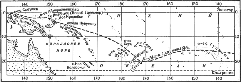 Выйдя в Тихий океан и повернув на север, Ле-Мер и Схаутен дали своим людям отдых на одном из о-вов Хуан-Фернандес, затем поднялись приблизительно до 15° ю. ш. и повернули на запад. 10—18 апреля они открыли по крайней мере четыре атолла всеверной части архипелага Туамоту (на три атолла они высаживались), 10—19 мая — пять вулканических «Кокосовых островов» к юго-западу и западу от архипелага Самоа[219]. От них они поднялись ближе к экватору, до широты северного берега Новой Гвинеи, и месяц не видели ни клочка суши, пока не прошли мимо атолла Нукуману (4° 30' ю. ш., 159° 25' з. д.). Продолжая путь на запад, Ле-Мер и Схаутен 24 июня подошли к большой группе островов, которую немцы в 1884 г. назвали архипелагом Бисмарка. За девять дней, следуя на северо-запад, они открыли пять групп островков (Грин, Фени, Танга, Лихир, Табар), простирающихся вдоль неведомого берега большой земли, которую они приняли за северо-восточную окраину Новой Гвинеи, а это был длинный и узкий о. Новая Ирландия, протягивающийся с юго-востока на северо-запад более чем на 300 км, а вместе с северным о. Лавонгай — более 400 км. На Новую Ирландию моряки высаживались. Обогнув с севера о. Лавонгай, Ле-Мер и Схаутен 3 июля вступили в Новогвинейское море, видели там несколько малых островов (из группы Адмиралтейства) и 5 июля подошли к северному берегу Новой Гвинеи. Следуя на некотором расстоянии от берега, они обнаружили на 2° ю. ш. и 145° в. д. несколько небольших вулканических островов, а у экватора и 136° в. д. (у северо-западного выступа Новой Гвинеи) более крупную группу — о-ва Схаутен. Оттуда «Эндрахт» перешел к Молуккам, к западному берегу о. Хальмахера, у которого были голландские торговые фактории. Когда же они прибыли на Яву (в октябре), агенты Ост-Индской компании арестовали Ле-Мера и Схаутена за нарушение торговой монополии и отправили на компанейском судне в Голландию. Ле-Мер умер в пути (в декабре 1616 г.), Схаутена на родине освободили. Его «Дневник или описание удивительного путешествия», изданный в Амстердаме на французском языке в 1619 г., выдержал около 40 изданий.