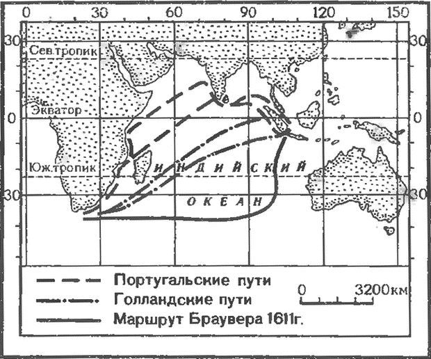 Как только голландцы появились на островах Индонезии, они начали искать новые пути от мыса Доброй Надежды к этим островам. Их пути шли значительно южнее португальских: португальцы в начале XVII в. еще владели рядом контрольных пунктов в северной полосе Индийского океана. Голландцы же пересекали центральную часть океана, обогнув с юга о. Мадагаскар, и после почти годичного плавания достигали Явы. На потенциальную ценность западных ветров, преобладающих в южной полосе океана (между 35 и 40° ю. ш.), первым обратил внимание голландец Хендрик Браувер. Для проверки своей идеи на практике 4 июня 1611 г. он отплыл на двух судах от мыса Доброй Надежды точно на восток по 36-й параллели. Поймав западный ветер, он добрался, по его предположениям, до меридиана Зондского пролива и, круто повернув на север, 18 августа 1611 г. прибыл на Яву. С 1613 г. по маршруту Браувера, более длинному, но отнимавшему почти в полтора раза меньше времени, прошли многие голландские капитаны. А с 1616 г. этот путь и даже более южный — вдоль 40° ю. ш. — стали официально санкционированными, т. е. обязательными, морскими трассами. Плавания голландцев доказали, что в полосе широт 35—40° ю. ш. нет никакой суши и что, следовательно, Южный материк имеет значительно меньшие размеры, чем показывали на картах начала XVII в. Голландцам все же удалось «засечь» два маленьких клочка земли, затерянных в морских просторах: в начале 1618 г. капитан Адриан де Балле у 38° ю. ш. и 78° в. д. усмотрел о. Амстердам, а Хаеик Клаасзон ван Хиллегом 19 апреля того же года на градус южнее обнаружил о. Сен-Поль.