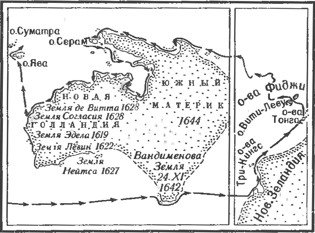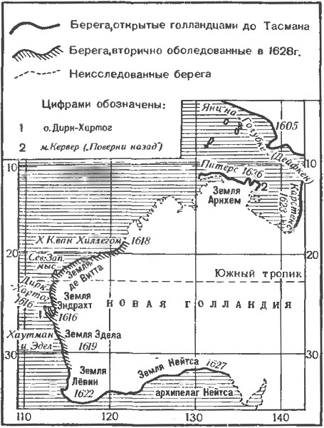 Продвигаясь в Индийском океане на восток между 30 и 40º ю. ш., голландцы часто близко подходили к западным берегам очень большой земли (Австралии), а иногда видели и даже посещали их, но находили там почти безжизненную пустыню и малочисленные группы бродячих охотников. Тем не менее это побережье представляло интерес для голландцев, так как только здесь они могли возобновлять запасы пресной воды. Поэтому Нидерландская Ост-Индская компания считала необходимым исследовать обращенные к Индийскому океану берега новооткрытого Южного материка; к тому же она рассчитывала найти поближе к экватору менее безотрадные и гуще населенные земли и охотиться там за рабами. Важным моментом в ходе открытия Австралии, которую в XVII—XVIII вв. называли Новой Голландией, было также жадное стремление найти новые районы скупки пряностей, месторождения золота или алмазов, жемчужные ловли. Частью Южного материка считалась Новая Гвинея, расположенная сравнительно близко от Явы. Первые известия об открытии голландцами Австралии относятся именно к попытке обследовать Новую Гвинею, северные берега которой, как мы говорили, были уже известны португальцам и испанцам. 28 ноября 1605 г. из Бантама (Западная Ява) на небольшом корабле (пинассе) «Дейфкен» («Голубок») к Южному материку отправился Биллем Янсзон, более известный под сокращенным отчеством Янц. В начале 1606 г., обойдя с севера о-ва Кай и Ару, он достиг «Болотистой земли» (заболоченного юго-западного берега Новой Гвинеи у 6° ю. ш.) и проследил ее на 400 км, до 8° ю. ш. Обогнув низменный выступ (о. Колепом), «Голубок» пересек центральную часть Арафурского моря в юго-восточном направлении и неожиданно наткнулся на какую-то землю — западный берег п-ова Кейп-Йорк. У устья небольшого потока (у 11°45' ю. ш.) голландцы произвели первую документально доказанную высадку европейцев на Австралийском континенте. Затем «Голубок» направился на юг вдоль плоского пустынного берега, но 6 июня 1606 г. от мыса Кервер («Поворот», у 13°50' ю. ш.) почему-то развернулся на 180°, хотя, как убедился Янц, берег тянулся и далее к югу. В заливе Албатросс[220], названном Янцем Мушиным, голландцы впервые столкнулись с австралийцами — с обеих сторон погибло несколько человек. Продолжая движение к северу, моряки проследили побережье п-ова Кейп-Йорк почти до его северной оконечности — таким образом общая длина открытой ими части австралийского полуострова, которую Янц окрестил Новой Гвинеей, составила около 350 км. Он фактически положил начало открытию залива Карпентария. Участник экспедиции Ян Лодевейк Россенгин, эмиссар компании, нанес обнаруженную землю на точную карту, дошедшую до наших дней. Далее к северу, уже в Торресовом проливе, о существовании которого голландцы, вероятно, не подозревали[221], они повстречали много островков и на самом крупном из них (Высоком — о. Принца Уэльского, у 10°45' ю. ш.) высаживались. «Голубок» благополучно миновал рифы, отмеченные на карте Я. Россенгина как «страшные», повернул на запад и вновь прошел вдоль «Болотистой земли». Северо-западнее (у 4° ю. ш.) пинасса подошла к побережью, которое на карте Я. Россенгина протягивается в широтном направлении более чем на 200 км и сопровождается надписью Ос Папуас. Таким образом Янц обнаружил еще один участок юго-западного берега Новой Гвинеи между 134 и 136° в. д., а затем вернулся в Бантам. Его пла