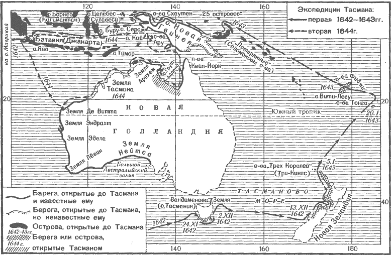 Все открытия голландцев на западных и южных берегах предполагаемой Южной земли были случайными и фрагментарными, оставив без ответа многие вопросы относительно ее размера и формы, а также коммерческой значимости. Для их разрешения в 1642 г. Ван-Димен направил из Батавии на о. Маврикий небольшую экспедицию (110 человек) на двух судах «Хемскерк» (120 т) и «Зехан» («Тригла»[231]), поставив во главе ее Абела Тасмана, который после экспедиции М. Кваста зарекомендовал себя как выдающийся мореход. От Маврикия Тасман должен был попытаться на возможно более высоких широтах обнаружить Южный материк, обогнуть с юга новую Голландию, через цепь Соломоновых о-вов вернуться в Батавию, а кроме того, разведать наиболее удобный путь от Индии к Чили и исследовать богатства тех стран Южного материка, которые он посетит. Эту инструкцию разработал опытный гидрограф Франс Якобсзон Вискер[232], назначенный главным штурманом экспедиции. И он, и Тасман пошли на «Хемскерке»; на «Зехане» ответственным за груз и картографом был Исаак Гилземанс. 8 октября 1642 г. Тасман отплыл от о. Маврикий на юг, а затем шел на восток, держась в полосе между 44—49º ю. ш. и борясь с западными штормовыми ветрами и снежными шквалами. Он, конечно, не встретил никакого материка и 19 ноября решил, что продвинулся восточнее пункта, до которого доходил Тейсен. Тогда Тасман повернул на северо-восток и 24 ноября при ясной погоде открыл у 42° 25' ю. ш. высокий берег, названный им Вандименовой Землей (теперь Тасмания[233]). Плохая погода помешала голландцам высадиться, и они двинулись вдоль южного выступа новооткрытой земли, обнаружив несколько прибрежных островков. 29 ноября за выступом Тасман нашел большой залив (Сторм), а 2 декабря, обойдя полуостров, носящий ныне его имя, направил на берег вооруженную группу моряков во главе с Ф. Вискером для пополнения запасов воды и продуктов. Их удивила высота и мощь деревьев с ароматной смолой — европейцы впервые познакомились с эвкалиптами. После второй высадки голландцы двинулись на север и положили на карту несколько прибрежных островков. 5 декабря Тасман достиг 42°30' ю. ш., проследив около 700 км береговой линии новооткрытой земли, и обнаружил, что она протягивается далее к северо-западу. В связи с тем что ветер постоянно дул с запада и северо-запада, Тасман решил продолжить плавание на восток. Он не знал, остров ли он открыл или южный полуостров Новой Голландии; и Вандименова Земля считалась полуостровом еще более полутора столетий, пока не был пройден Бассов пролив. После девятидневного плавания в восточном направлении через акваторию, позже названную Тасмановым морем, 13 декабря 1642 г. у 42 10' ю. ш. голландцы увидели высокую землю — Южные Альпы Южного острова Новой Зеландии. Подойдя ближе к берегу, суда повернули на северо-восток, обогнули мыс Фаулуинд и косу Фэруэлл-Спит и, проследив со съемкой около 600 км побережья, 18 декабря вошли в удобную бухту у 40° 40' ю. ш. Здесь произошла первая встреча с маори — народом, населяющим оба острова Новой Зеландии. Они убили трех матросов-голландцев, по утверждению Тасмана, без малейшего повода. Он окрестил эту гавань «бухтой Убийц» — теперь она называется Голден-Бей, т. е. «Золотая». 20 и 21 декабря суда крейсировали в акватории между Южным и Северным островами Новой Зеландии; Тасман присвоил ей имя «бухта Зехан», хотя сам же отметил прилив, 