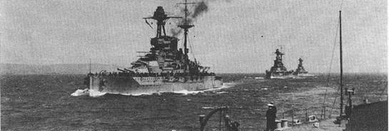 11-го ноября я вернулся в Инвергордон. «Iron Duke» уже вышел из дока и стоял на рейде. Все работы были закончены, и корабль находился в четырехчасовой боевой готовности. 16-го ноября утром мы в сопровождении двух эскадренных миноносцев вышли из Кромарти и пошли на север в Пентландский залив, где к нам должен был присоединиться линкор «Royal Sovereign». Однако мы не застали его в условленном месте и, прокрейсировав к югу от Оркнейских островов в течение часа, пошли в восточном направлении. С наступлением темноты миноносцы были отпущены, и ход уменьшился до 15 узлов. В 7 часов вечера береговая радиостанция передала нам приказание присоединиться на следующее утро в 7 часов к Гранд Флиту у Фишербанки. Мы леглина SO, не прошло и часа, как было принято радио о 20 убитых и 70 раненых на отряде легких крейсеров, в состав которых входили «Calliope», «Cardif». Радио сообщало также, что крейсер «Glorious» принужден был выйти из строя и что одно из его 15-ти дюймовых орудий сильно повреждено. Неприятель также пострадал; на одном из его крейсеров был виден пожар. Преследование противника было прекращено, так как на месте боя появились неприятельские линейные корабли. В семь часов утра у нас была пробита боевая тревога; на горизонте виднелись дымы, и, когда минут через двадцать взошло солнце, мы увидели Гранд Флит, корабли которого выстраивались в дневной походный порядок. Над эскадрами были подняты три привязных аэростата. Мы вскоре присоединились к Гранд Флиту и вступили в своё место на левом фланге 2-ой дивизии, шедшей в строе пеленга. Главные силы флота шли подивизийно также в строе пеленга. В голове шла 1-ая эскадра, за ней 2-ая эскадра с флагманским кораблем флота «Queen Elisabeth», в хвосте 4-ая эскадра; 5-ая эскадра, в составе четырех кораблей типа «Barham», шла на правом фланге в 5 милях от ядра флота в одной кильватерной колонне. Легкие крейсера и эсминцы образовали по обыкновению завесу против подводных лодок впереди и на флангах флота; линейные крейсера отстояли в 30 милях от флота линкоров. Наше соединение с Гранд Флитом произошло как раз в пределах водного пространства, где разыгрался Ютландский бой. Впервые с 31-мая 1916 г. флот проходил опять эти места. В 11 часов утра мы легли на S, перестроили наш походный порядок и шли теперь в шести параллельных кильватерных колоннах. Все были полны больших ожиданий и надеялись у Хорн-Риффа натолкнуться, по крайней мере, на неприятельские подлодки и цеппелины; погода была для них самая благоприятная. Наши надежды, однако, не осуществились, Хорн- Рифф остался вне нашей видимости. В 2 часа дня, на широте Хорн-Риффа, мы легли на обратный курс и в 5 часов вечера, когда начинало уже смеркаться, повернули на NW. У Доггербанки светил плавучий маяк, выставленный голландцами, чтобы обозначить нейтральным пароходам границу минного заграждения, поставленного к югу от отмели. Миновав маяк, мы легли на W, и дальнейший ночной поход прошел без каких-либо происшествий. На следующее утро наша эскадра (1-ая) была послана в Ферт-оф-Форт. Мы прошли минные и сетевые заграждения и подошли под знаменитый мост. Я знал отлично, что наши мачты должны пройти под аркой моста, но все же, по мере приближения к нему, во мне зародилось забавное чувство сомнения – казалось, будто мост неминуемо срежет нам стеньги… Фор-стеньга прошла, однако, свободно под мостом, а так как грот-стеньга была 