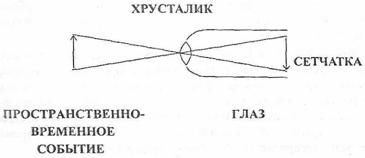 Стрелка слева, направленная вверх, символизирует «объект», или, точнее говоря, пространственно-временное событие. Световые лучи от этого экзистенциального узла, или энергетического скопления, попадают на хрусталик глаза, который, как и любая другая линза, их преломляет. После этого они попадают на сетчатку, которая регистрирует перевернутую «картинку». Однако мы видим окружающий мир не перевернутым!Сетчатка — это часть синергической системы глаз — мозг, и прежде, чем мы начинаем сознательно воспринимать этот энергетический узел, мозг успевает проинтерпретировать, отредактировать и перевернуть сигнал в обычную геометрическую систему координат, в которой мы привыкли «регистрировать» информацию.Некоторым людям кажется, что они понимают эту мысль с первого раза. Другие люди при сотом объяснении внезапно кричат «Эврика!» и считают, что, наконец, действительно что-то поняли. Как показывает мой опыт проведения семинаров на подобные темы, для глубокого понимания сути этой идеи человеку нужны наглядные эксперименты. Я настойчиво рекомендую вам самостоятельно поставить описанный ниже эксперимент.Попросите друга взять газету, которую вы еще не просматривали. Сядьте на стул и попросите его встать на таком расстоянии от вас, чтобы вы смогли прочитать только крупные заголовки. Затем пусть он медленно отодвигается, пока вы не перестанете различать эти заголовки. Попросите его перевернуть страницу (чтобы вы наверняка не смогли ничего разобрать) и прочитать эти заголовки вслух. Тогда вы сразу отчетливо их «увидите».Повторяю: только самостоятельное проведение этого эксперимента, а не знакомство с его описанием позволит вам глубоко понять смысл идеи, которой Бакминстер Фуллер любил удивлять своих слушателей.Аристотель, не имея представления о современных законах оптики, тем не менее прекрасно понимал общие принципы, рекомендуя говорить не «я вижу», а «я увидел». С момента поступления светового сигнала в наш глаз до момента формирования «восприятия», или «образа» в нашем мозгу, всегда проходит какой-то, пусть малый, промежуток времени. За это время мозг успевает придать сигналу форму, значение, цвет и т. д.Все сказанное о зрении справедливо для всех остальных чувств.Поэтому кажется, что если не полный, то хотя бы частичный агностицизм (то есть признание того, что все идеи носят предположительный характер и выведены путем логического заключения) неизбежен. Однако и сам Аристотель, и многие современные философы еще совсем недавно старательно обходили этот вопрос, утверждая, предполагая или надеясь, что существует метод, позволяющий избавиться от неопределенности восприятия и, таким образом, ввести определенность в общие принципы.Первым (или будем считать, что первым) пошатнул устои этой веры Юм, хотя о крахе определенности говорили многие философы. Основной принцип современного релятивистского мировоззрения кратко формулируется так: вероятность прийти к определенным выводам при неопределенном восприятии сводится к нулю. Невозможно подсчитать точную сумму, если все слагаемые указаны приблизительно, например: около двух фунтов, около полутора фунтов и так далее. Если восприятие не абсолютно, выводы из него тоже не могут быть абсолютными. Как бы искусно вы ни жонглировали приближениями, ни одно волшебство не поможет вам превр