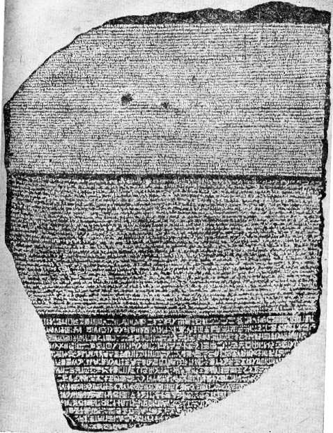 Однако это было не так просто, как могло показаться с первого взгляда. Многие учёные пытались подобрать ключ к этой надписи, но у них не было достаточной подготовки; они могли только угадывать, а не идти путём научного исследования и изучения текста. В 1808 г. над дешифровкой надписи на Розеттском камне начал работать 18-летний учёный Франсуа Шампольон. Он великолепно владел греческим языком и латынью, хорошо знал коптский, свободно говорил и писал на арабском языке. В 20 лет он уже был «доктором словесности». Именно эта серьёзная научная подготовка и прекрасное знание древних языков помогли молодому учёному решить его трудную задачу. Вооружённый такими знаниями, Шампольон подошёл к разгадке Розеттского камня не тем путём, что его предшественники. Прежде всего Шампольон попробовал подставить буквенные значения к иероглифам в имени «Птолемей». Первый (верхний левый) иероглиф имени в картуше он попытался читать как п; нижний левый иероглиф — как т, следующий за ними — как о; иероглиф, похожий на рисунок сидящего льва, — как л; иероглиф, находящийся под этим рисунком, — как м; два следующих иероглифа — как ай, и, наконец, последний иероглиф — как с. Получилось «Птолмайс». По сравнению с греческим произношением этого имени «Птолемайос» в египетском не хватало буквы е и второго о. Выходило, что египтяне произносили не «Птолемайос», а «Птолмайс». Но Шампольона это не смутило, так как он хорошо знал, что в таких языках, как арабский и древнееврейский, гласные буквы очень часто пропускаются. Следовательно, он имел основание предположить, что и в египетском языке тоже, может быть, некоторые гласные выпадают. Однако это было только начало дешифровки. Ведь он прочёл одно лишь имя, сомнения в точности чтения были вполне закономерны. Через некоторое время Шампольону посчастливилось найти другой памятник, на котором он прочёл имя царицы Клеопатры. Благодаря этому имени Шампольон узнал несколько новых иероглифов и утвердился в чтении уже знакомых иероглифов, как л, о, п, и т, которые встречаются в обоих именах. Постепенно Шампольон перешёл от чтения имён к чтению отдельных слов и даже целых фраз. В понимании прочитанного ему помогло знание коптского языка, в котором сохранились общие корни с древнеегипетским. Наконец, Шампольон убедился в том, что он действительно нашёл ключ к чтению египетских иероглифов и понимает древнеегипетский язык. 27 сентября 1822 г. он сделал об этом доклад на заседании Академии наук в Париже, где присутствовало много европейских учёных из разных стран. Эта дата считается днём рождения новой науки — египтологии. Значительно более трудным делом оказалась дешифровка другого древневосточного письма, называемого «клинописью». Это название при думал в XVII в. итальянский путешественник — купец Пьетро делла Валле, который побывал в Персии. Он увидел там на больших каменных плитах, в развалинах дворца в Персеполе, странные узоры, состоящие из углублённых клинышков, врезанных в камень. Пьетро делла Валле внимательно рассматривал необычайный узор и пришёл к выводу, что это надпись, в которой каждый знак обозначает, может быть, целое слово, что их следует читать не справа налево, как обычно читаются все книги восточных народов, а слева направо. На эту мысль его натолкнуло направление косого клинышка, который иногда вставлялся межд