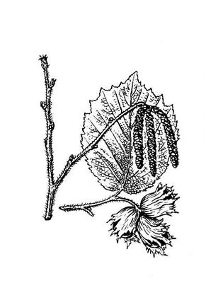 Лещина обыкновенная: а — ветвь с тычиночными серёжками; б — ветвь с плодами.