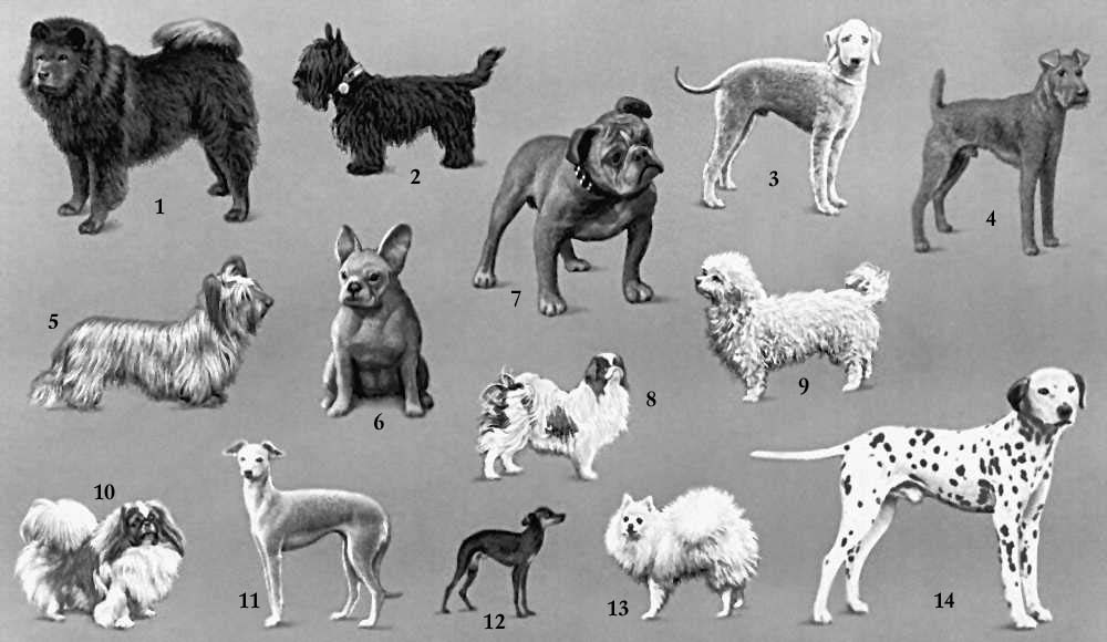 Декоративные собаки: 1. — Чау-чау. 2. — Шотландский терьер. 3. — Бедлингтонтерьер. 4. — Ирландский терьер. 5. — Скайтерьер. 6. — Французский бульдог. 7. — Английский бульдог. 8. — Японский хин. 9. — Мальтийская болонка. 10. — Пекинская собака (пекинес). 11. — Левретка. 12. — Тойтерьер. 13. — Карликовый шпиц. 14. — Далматская собака.