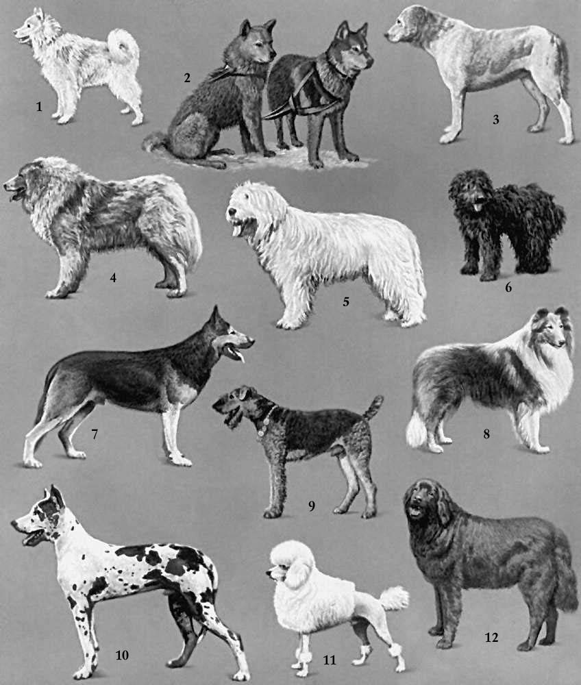 Служебные собаки: 1. — Ненецкая (оленегонная) лайка. 2. — Ездовые лайки. 3. — Среднеазиатская овчарка. 4. — Кавказская овчарка. 5. — Южнорусская овчарка. 6. — Пули. 7. — Немецкая овчарка. 8. — Колли (шотландская овчарка). 9. — Эрдельтерьер. 10. — Дог. 11. — Пудель. 12. — Ньюфаундленд (водолаз).