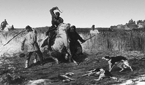 Охотничьи собаки: 1. — Русско-европейская (русская) лайка. 2. — Западно-сибирская лайка. 3. — Русская псовая борзая. 4. — Среднеазиатская борзая (тазы). 5. — Хортая борзая. 6. — Афганская борзая. 7. — Южнорусская степная борзая. 8. — Спаниель. 9. — Русская гончая. 10. — Русская пегая гончая. 11. — Английский сеттер. 12. — Пойнтер. 13. — Короткошёрстная немецкая легавая. 14. — Ирландский сеттер. 15. — Жесткошерстный фокстерьер. 16. — Гладкошёрстный фокстерьер. 17. — Жесткошёрстная немецкая легавая. 18. — Такса.
