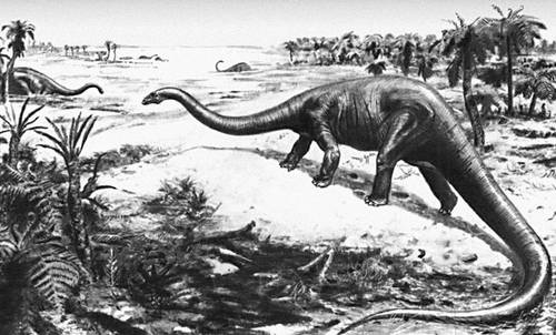 Рис. 1. Позднеюрский ландшафт. Северная Америка. На переднем плане крупный (27 м