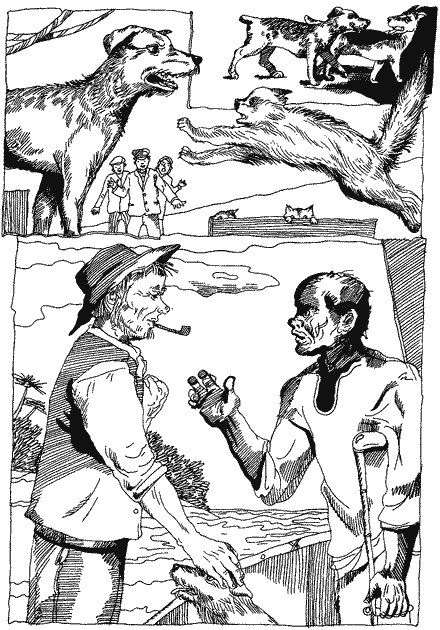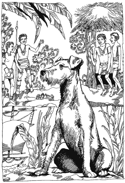Крім того, на борту «Еренджі» звичайно був хоч один дикунський собака, і Джеррі та Майкл могли досхочу гавкати на нього з берега. Одного разу Теренс, зростом не набагато менший від ерделя, а відвагою нітрохи не гірший — Том Гегін називав його Теренсом Безстрашним, — спопав на березі такого собаку й завдав йому знаменитої прочуханки. Джеррі, Майкл і Петсі та Кетлін, тоді ще живі, теж хапали чужинця гострими зубенятами, заливаючись дзявкотом. Джеррі ще не забув тієї нестямно чудової хвилини, коли він захопив повну пащу шерсті, запахом безперечно собачої. Дикунські собаки теж були собаки — він упізнавав у них своїх родичів; але вони чимось різнилися від його власної вельможної породи, були нижчі створіння — так само як тубільці супроти містера Гегіна, Дербі та Боба.