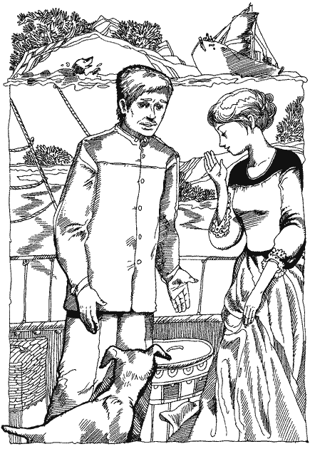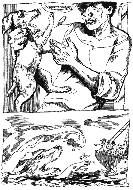 Надвечір, ще раз провчивши дике собача, Джеррі прибіг на корму й знайшов там Шкіпера, що сидів з підібганими коліньми на палубі, спираючись спиною на низенький фальшборт, і бездумно вдивлявся кудись у завітряний бік. Джеррі понюхав Шкіперову голу литку — не на те, щоб розпізнати, а просто так йому захотілось, і то було немов дружнє вітання. Та Ван-Горн і не глянув на нього й дивився, як і перше, на море. Він навіть не помітив щеняти.