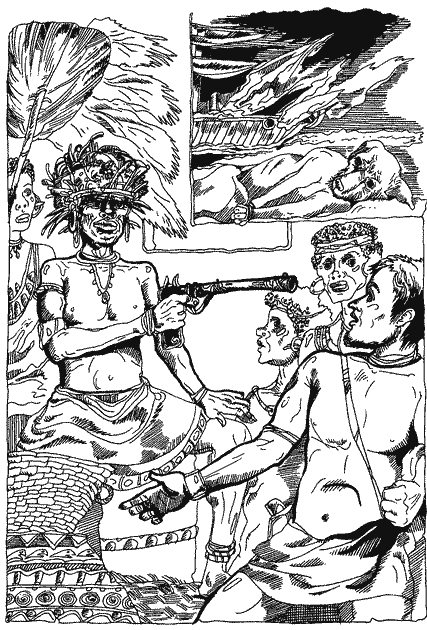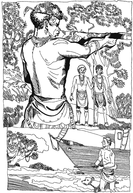 Помічник і капітан, що завжди носили на поясі автоматичні пістолети, тепер почали бити з них, вистрілюючи магазин за магазином, а тубільцям аж дух займався з подиву, що вони стріляють так казково швидко. З матросів стрільці були абиякі, але Ван-Горн, як і всі шкіпери на Соломонових островах, знав, що побережні й лісові тубільці стріляють іще набагато гірше, а тому можна покластись і на таких стрільців, як його матроси, — якщо тільки в скрутну хвилину вони самі не обернуться проти нього.