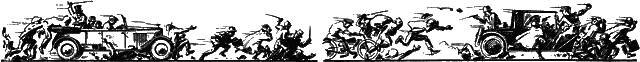 Воровато приползли сумерки и серой мутью залегли на улицах и площадях Нью-Йорка. А за ними глухая осенняя ночь окутала замолкший гигант-город. Но паника не стихла, а, наоборот, разрасталась с быстротой степного пожара. Еще днем в ужасе разбежались из всех нью-йоркских магазинов, контор, банков, учреждений, фабрик и заводов служащие и рабочие. Замерла почта, телеграф, остановились железные дороги, прекратили работу городской водопровод и никому ненужная теперь телефонная станция. Электро-станции, питавшие Нью-Йорк электрической энергией, также были панически брошены инженерами и рабочими. Остановились все трамваи и автобусы, застряли на полпути в темных тоннелях поезда подземных железных дорог, повисли на двадцатиметровой высоте надземные… Благодаря остановке электро-станций, тьму ночи не прорезали уже миллионы огней, и оглохший, ослепший Нью-Йорк забился в еще более страшной, судорожной панике… Ожидая вслед за глухотой новых страшных напастей, может быть, полного уничтожения всего города, нью-йоркцы бросились к вокзалам. Увидав там холодные, потухшие паровозы, застрявшие на путях составы, безлюдные перроны, пустые депо, кассы, бюро, — все брошенное в панической спешке, — толпы ринулись обратно в город. И тогда-то началось великое бегство нью-йоркцев. Бежали на уходивших спешно из нью-йоркского порта пароходах, на моторных и гребных лодках, на гоночных яхтах, на грязных буксирах и даже полицейских катерах. Вся эта масса судов устремилась разом к выходу из гавани, в результате чего наиболее слабые и наименее увертливые суда с пробитыми бортами ныряли на дно. По суше нью-йоркцы удирали на автомобилях, мотоциклетах, велосипедах, даже на лошадях, выкраденных из манежей и спортивных клубов. Одна мысль, одно желание было у каждого мало-мальски состоятельного нью-йоркца: как угодно, на чем угодно, за сколько угодно, но уехать из оглохшего города. Дворцы аристократической Пятой Авеню опустели моментально. Архи-миллиардеры, миллиардеры и просто миллионеры с семьями погрузились на мощные автомобили и потянулись к заставам. Но на окраинах их остановили баррикады, сложенные городской беднотой и рабочими. Пикеты потребовали: — Коли погибать, так и вам вместе с нами. Завертывайте назад. Нефтяные, угольные, мясные, стальные и прочие короли попробовали было револьверными выстрелами прочистить себе дорогу. Однако, увидя кое-где своих собратьев, болтающихся в петлях на фонарных столбах, богачи поняли, что шутки с голытьбой плохи, и, нехотя, медленно повернули обратно к своим дворцам. А ночью, все же обманув рабочие кварталы, улетели из Нью-Йорка на аэропланах…