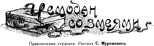 У приехавшего в Н-ск студента оказалось небольшое нервное расстройство, и он пролежал в постели две недели, во время которых тяжелый кошмар в вагоне представлялся ему с мучительной ясностью. Несколько оправившись от болезни, он первый раз пошел на лекции, которые начались уже две недели тому назад. Затем, на другой день, захватив уцелевший небольшой чемодан, он отправился к профессору: — Видите ли, профессор, по независящим от меня обстоятельствам я смог привезти вам лишь самое незначительное количество змей… На лице профессора изобразилось приятное удивление. — Вы привезли мне змей?.. Живых змей?.. А нуте-ка дайте взглянуть… Студент открыл чемодан и развязал кожаный мешок, в котором слышалось сердитое шипение. — Здесь двадцать штук. У меня было гораздо больше, но… — Двадцать штук?!. — переспросил удивленный профессор. — Это очень хорошо… Представьте, я этого не ожидал… Никто не привез мне ни одной змеи. Вы один единственный человек… Спасибо, спасибо. «Так вот оно что!», — подумал студент, до сих пор никак не могший об'яснить себе радости профессора, так как предполагал, что другие привезли сотни. Получив свои 150 рублей, студент зашел пообедать, выпил кружку пива и отправился на лекцию. «Жаль, крайне жаль, что украли большой чемодан, — думал он дорогой, — полтораста змей — это больше тысячи рублей…» Но, вспомнив о происшествии в вагоне, он махнул рукой: «Ну, да чорт с ними. Во всяком случае, вору это будет на пользу: отучится воровать…»