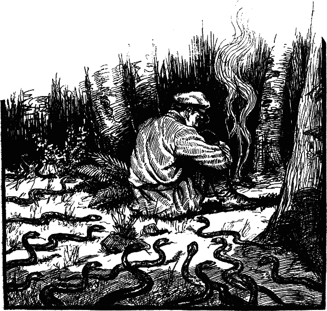 То, что он увидел около себя, заставило его содрогнуться всем телом: вокруг догорающих остатков костра, при голубом сиянии только что взошедшей луны, с тихим шелестом двигались десятки блестящих черных лент. В диком ужасе человек внезапно сорвался с места, и куча хвороста с шумом обрушилась на землю. Как безумный, он бросился к дереву и во время своего бега чувствовал, как ноги его ступали на что-то извивающееся и скользкое: это были змеи…