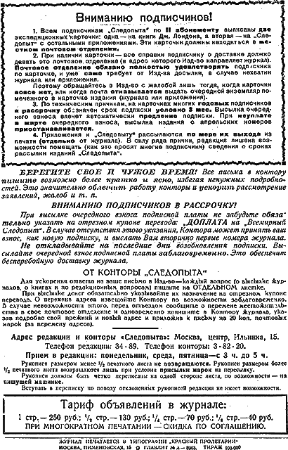 Деньги переводите по адресу: Москва, центр, Ильинка, 15, контора журнала «Всемирный Следопыт», обязательно указывая «на самолет». Взносы до 1 рубля можно присылать почтовыми марками, вкладывая их в конверт. Наклеивать марки на сопроводительное письмо ни в коем случае нельзя. Московские читатели (подписчики) могут вносить деньги в Московской конторе Госбанка, на текущий счет № 2262. Высылая подписную плату — прибавляйте, кто сколько может, на самолет!