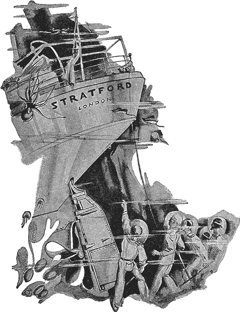 Наш корабль последовал за нами в Маракотову бездну..! Когда первое сильное впечатление прошло, зрелище показалось нам не таким уж загадочным. Мы вспомнили пасмурную погоду, зарифленные паруса норвежского барка и черное клубящееся облако на горизонте перед нашим спуском. Ясно, что наверху внезапно разразился чудовищной силы циклон, разбивший вдребезги «Стратфорд». Было совершенно очевидно, что команда яхты погибла, потому что все шлюпки, хоть и полуразбитые, висели на талях[21]. Да и какая шлюпка могла бы спастись в такой ураган? Трагедия, несомненно, произошла через час-два после нашей катастрофы. Лот, который мы видели на дне, был, возможно, брошен за несколько минут до первого порыва циклона, и было нечто странное в сознании, что мы еще живы, а те, кто, может быть, оплакивал нашу гибель, погибли сами. Бедный капитан Хови — вернее, то, что от него осталось — все еще стоял на своем посту на капитанском мостике, крепко вцепившись в перила окоченевшими пальцами. Только он и трое кочегаров в машинном отделении утонули вместе с яхтой. Всех их, по нашим указаниям, вынули и погребли под слоем векового ила, украсив могилы подводными цветами. Я упоминаю об этой подробности в надежде, что она несколько смягчит тяжкое горе мистрис Хови. Имена кочегаров нам не известны. Пока мы выполняли этот скорбный долг, по яхте сновали атланты. Они кишели всюду, как мыши в забытом сыре. Их любопытство и возбуждение ясно доказывало, что «Стратфорд» — первый современный корабль — может быть первый пароход — когда-либо попадавший в их бездну. Позже мы узнали, что кислородные аппараты внутри стеклянных колпаков позволяли атлантам находиться под водой всего несколько часов без перезарядки на особой станции; поэтому их познания по топографии морского дна были ограничены сравнительно небольшой территорией — не более десяти километров от центральной базы. Атланты сразу же принялись за дело, роясь в каютах «Стратфорда», снимая с него все, что им могло пригодиться. Это паломничество за оборудованием яхты происходит непрерывно и теперь еще не совсем закончено. Мы тоже были рады случаю проникнуть в свои старые каюты и унести оттуда всю одежду и книги, уцелевшие при катастрофе. Среди имущества, снятого нами со «Стратфорда», был и корабельный журнал, который велся капитаном до самого последнего момента. И опять было странно читать о собственной гибели и видеть гибель того, кто о ней писал.