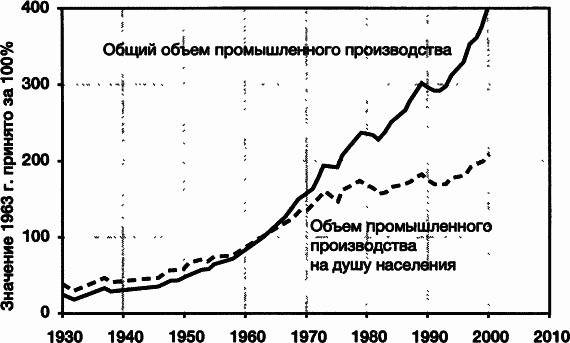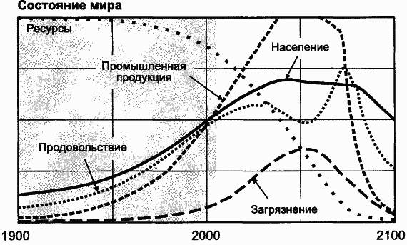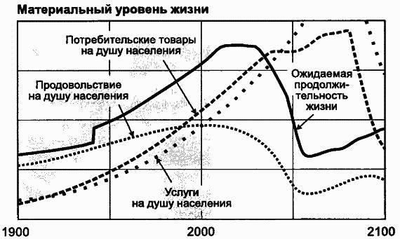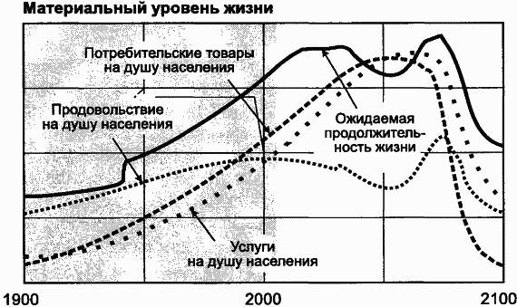 17. Понятие потребительские товары на душу населения отражает долю промышленной продукции, направляемой на прямое потребление населением, например, машины, бытовая техника, одежда и обувь. Это составляет порядка 40 % суммарного производства. Сюда не входят продовольствие, услуги, инвестиции — они учитываются отдельно. В нашей модели потребительские товары, промышленная продукция и услуги отображают реальные, физические предметы и понятия, однако измеряются они в долларах, поскольку это единственный вид единиц, применяемых в экономических расчетах. В исходной модели все расчеты проводились в долларовых ценах 1968 г., и причин изменить такой подход у нас не было, ведь нас интересовали относительные соотношения, а не абсолютные значения благосостояния. Поскольку сейчас, спустя несколько десятков лет, людям было бы сложно оперировать долларовыми ценами 1968 г. (а тогда доллар был почти вчетверо весомее доллара 2000 г.), в обсуждениях в книге мы ограничивались только относительными экономическими понятиями.