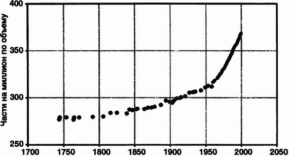 96. Эти данные получены из анализа проб льда, высверленных с различных глубин антарктического ледяного щита. Льды на полюсах накапливаются в течение многих тысяч лет, слой за слоем, и в каждом из них сохраняются пузырьки воздуха, характеризующие отдаленные геологические эпохи. Изотопный анализ позволяет датировать пробы льда, это дает ключ к пониманию того, какие температуры были в те времена на планете; непосредственный анализ проб воздуха из пузырьков позволяет определить процентное содержание диоксида углерода и метана в воздухе.