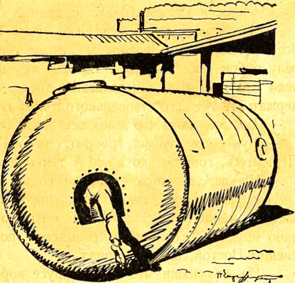 Пробежав мимо куч старых ржавых труб, прожженных варочных котлов, чугунного лома — Тонька забежал под длинный навес склада. Это самое оно и есть место заводских мальчишек: тут все как нарочно приспособлено для игры в кулюкушки — иной раз так спрячешься, что и не найдут, да и сам выберешься не сразу. Тонька шмыгнул под навес, туда, где лежал на боку клепанный из полуторадюймового железа бак в виде бочки — в поперечнике примерно футов восемь[7].