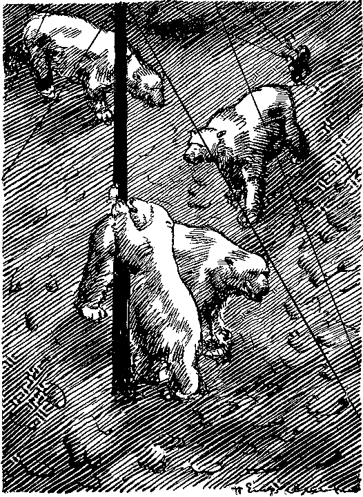 Легкая лесенка в метеорологическую будку была сломана, очевидно не выдержав тяжести зверя. На одной из мачт виднелся след когтей до высоты четырех метров, поверхность бревен мачтовой сосны была изодрана в мочалу. Около якорей мачтовых вант снег был изрыт до земли: очевидно медведей очень заняло и позабавило схождение в одну точку к анкеру целого веера стальных, туго натянутых канатов, уходящих ввысь, — медведи тут играли и резвились…