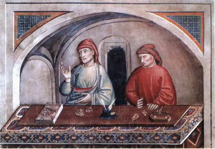 Никколо ди Пьетро Герини. Итальянские банкиры. Ок. 1395 г. Монастырь Св. Франциска. Hato.