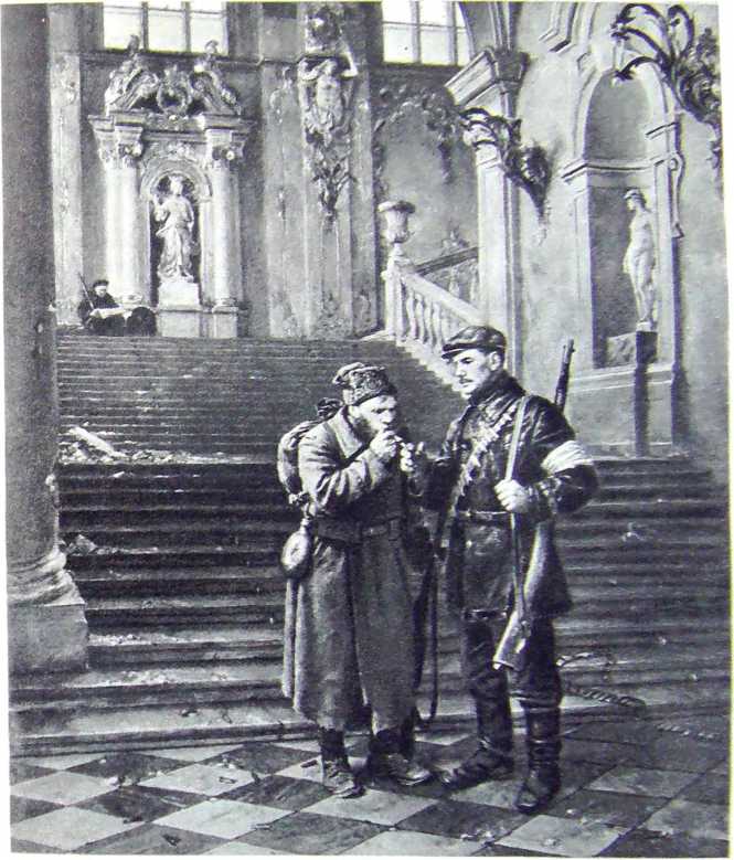 Закончилась ночь на 26 октября 1917 года. Увезены в Петропавловскую крепость министры Временного правительства. Опустел дворец, и усталые часовые переводят дух после ночного штурма. Картина "Зимний взят" В. Серова.